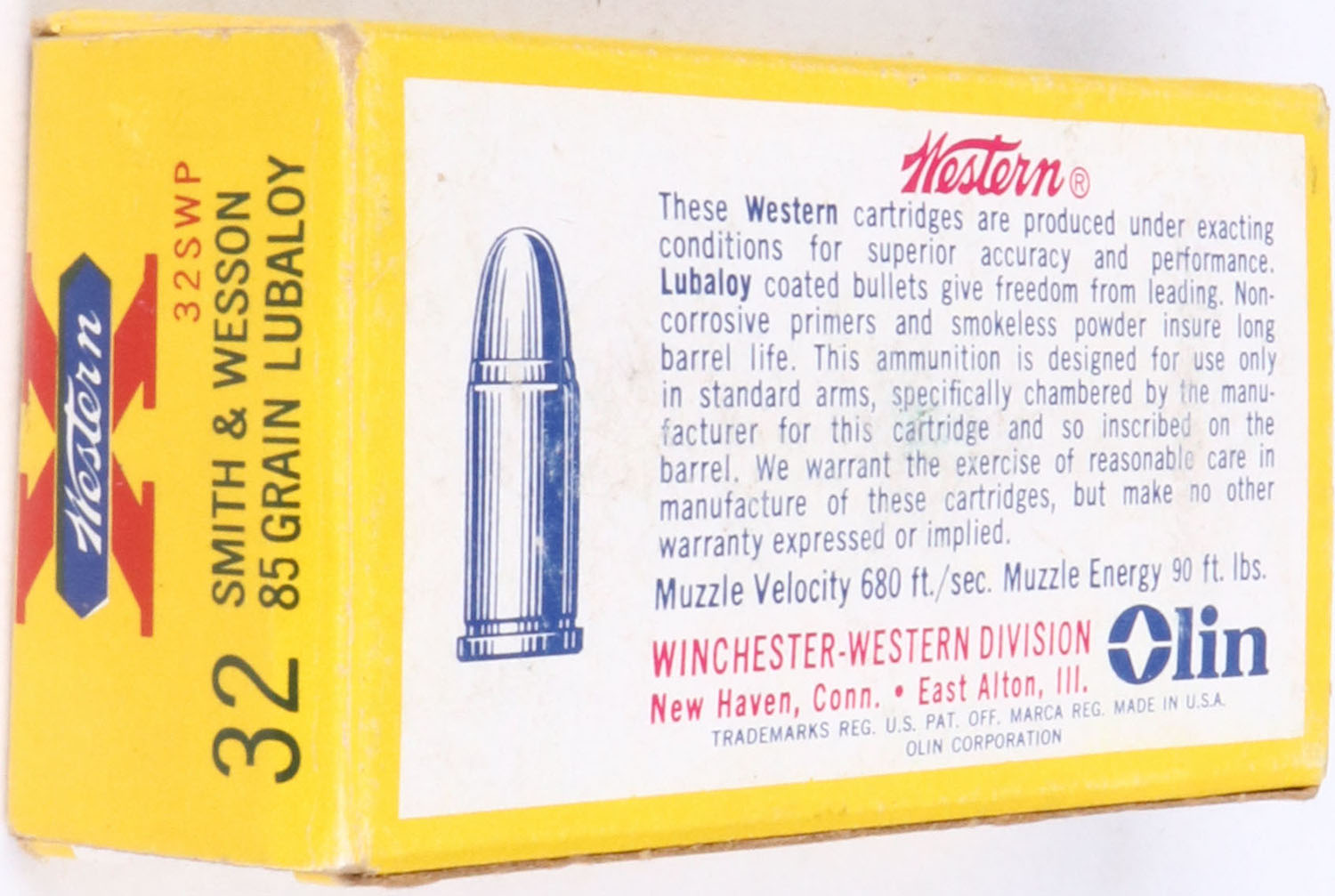 Western, Super-X, .32 S.&W., 85 Gr. LUBALOY inside lubricated Bullet, 1pc, Partial around 40 Rds., yellow box with white label & black/red/blue print, box is solid with sticker on front, pen marks, light rub wear & light edge/corner wear, ammo is very good. Grade: Very Good ++ - Value: 30 to 60