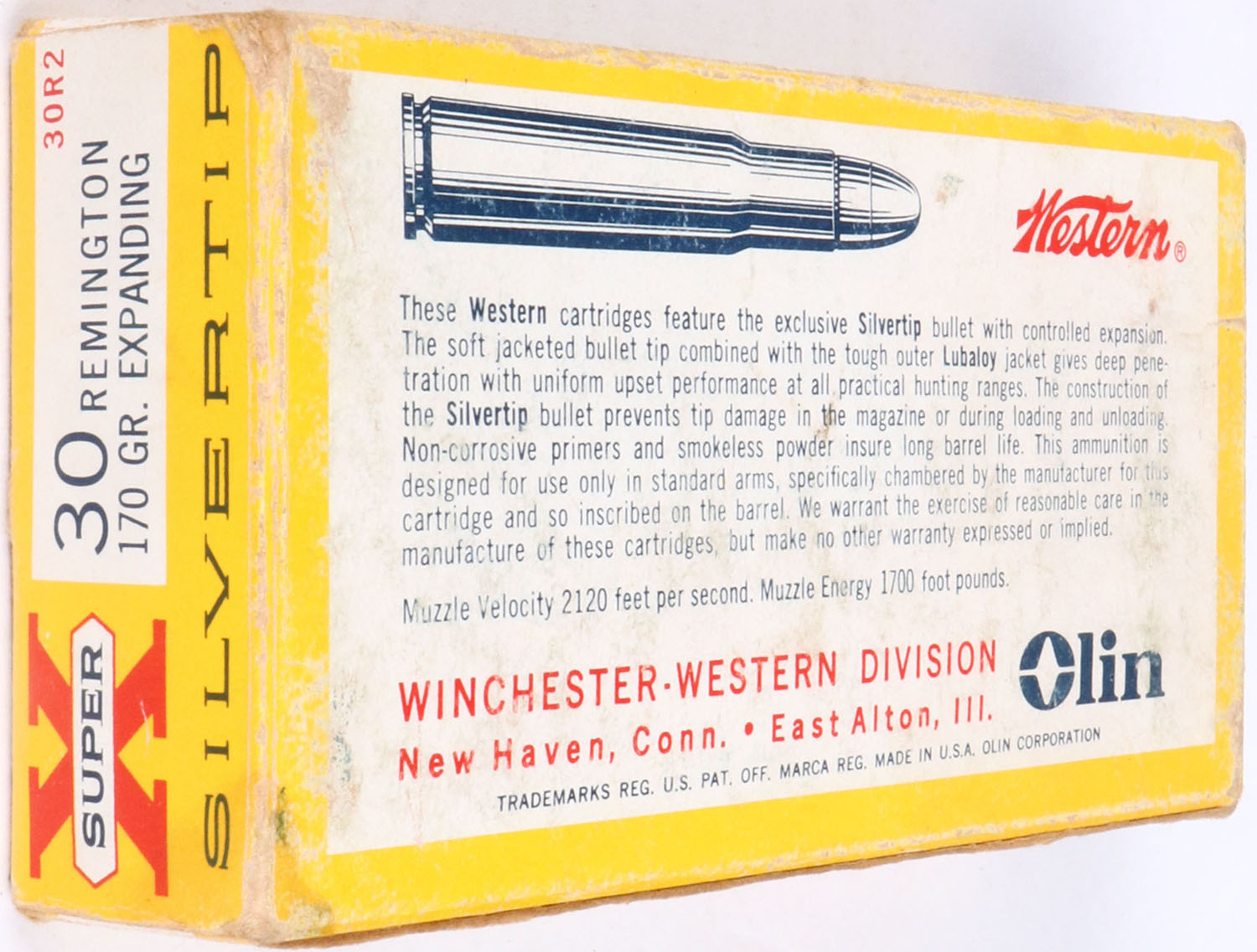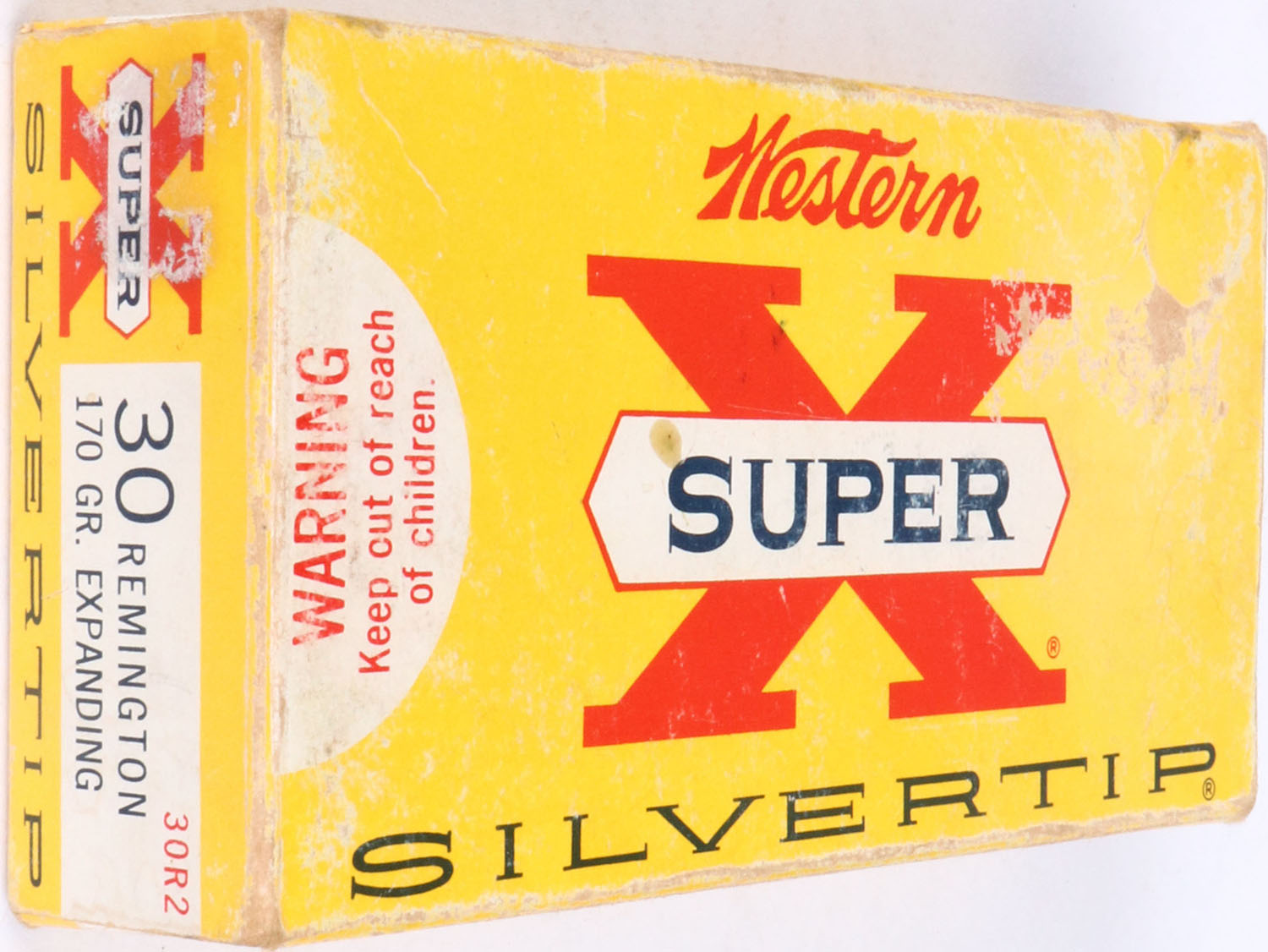 Western, Super-X SILVERTIP, .30 Remington, 170 Gr. Silvertip bullet, 1pc, Full, yellow box with white label & red/black print, box is solid with rub marks, & light edge wear, ammo is excellent. Grade: Excellent - Value: 30 to 90