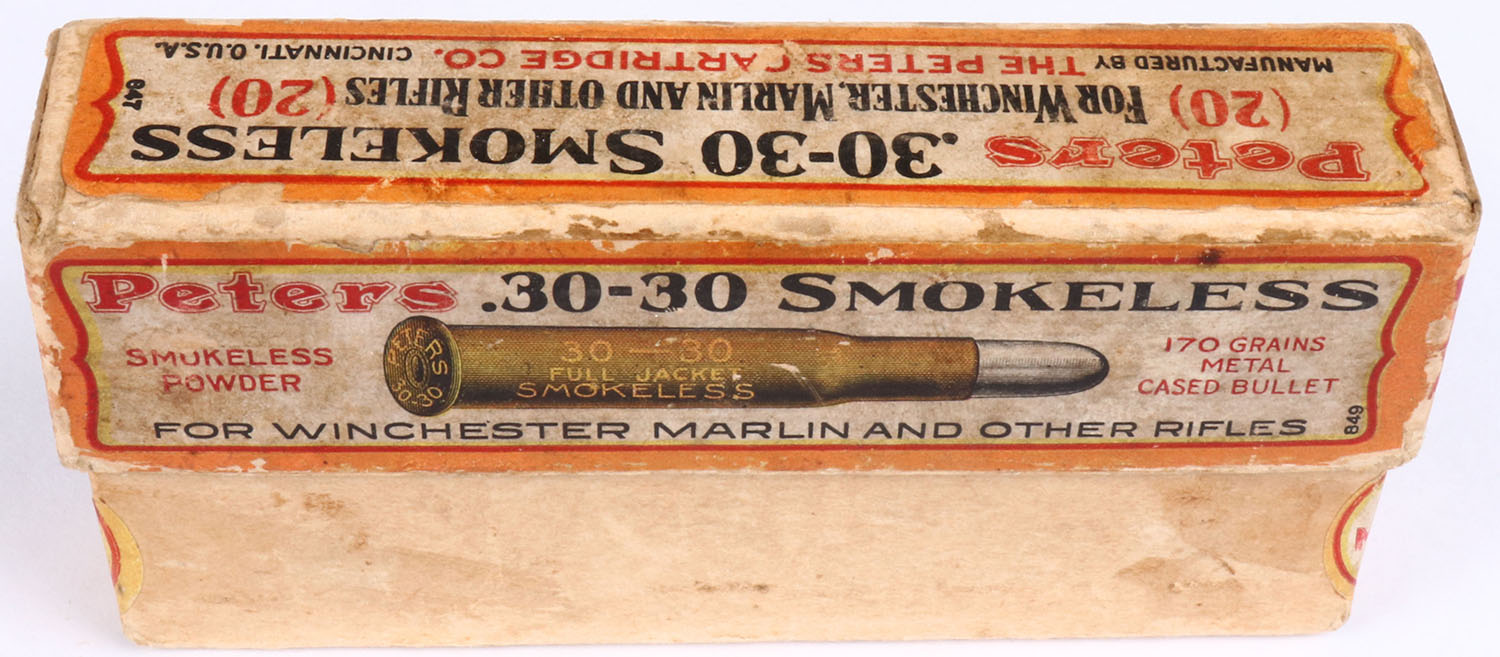 Peters, .30-30, 170 Gr. Metal cased Bullet, Smokeless, 2pc, Full, buff box with orange/red/yellow/white label & black/red print, box is solid with light age soiling, light rub marks & light edge/corner wear, ammo is very good. Grade: Very Good ++ - Value: 30 to 120