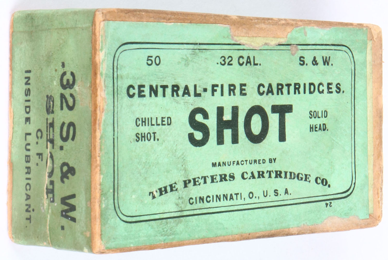 Peters, .32 S.&W. SHOT, Solid Head, Chilled shot, Inside Lubricant, 2pc, FULL & SEALED, buff box with green label & black print, box has one split end seam on right end, two torn seams on right end on top, pencil marks, light age soiling, & light edge wear. Grade: Very Good ++ - Value: 30 to 90