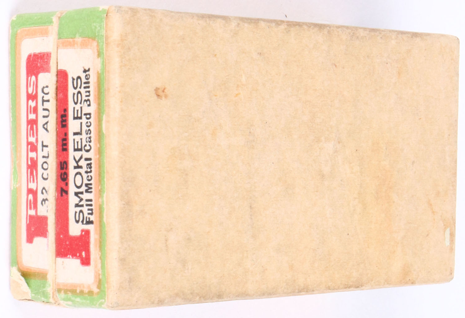 Peters, .32 Colt Automatic, Full Metal cased bullet, smokeless, 2pc, Partial 33 Rds., buff box with green/red/buff label & black print, box is solid with rub marks & light edge/corner wear, ammo is very good. Grade: Excellent - Value: 20 to 60
