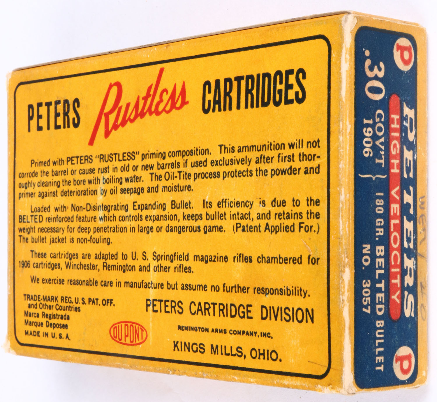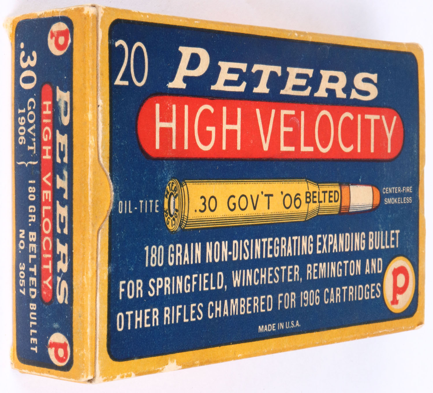 Peters, High Velocity, .30 Gov't 06 Belted, Smokeless, 180 Gr. Non-disintegrating expanding bullet, 1pc, partial 18 Rds., yellow box with blue/red label & white/black print, box is solid with light pencil marks, one inside flap missing on right side, & light wear, ammo is excellent. Grade: Excellent - Value: 20 to 60