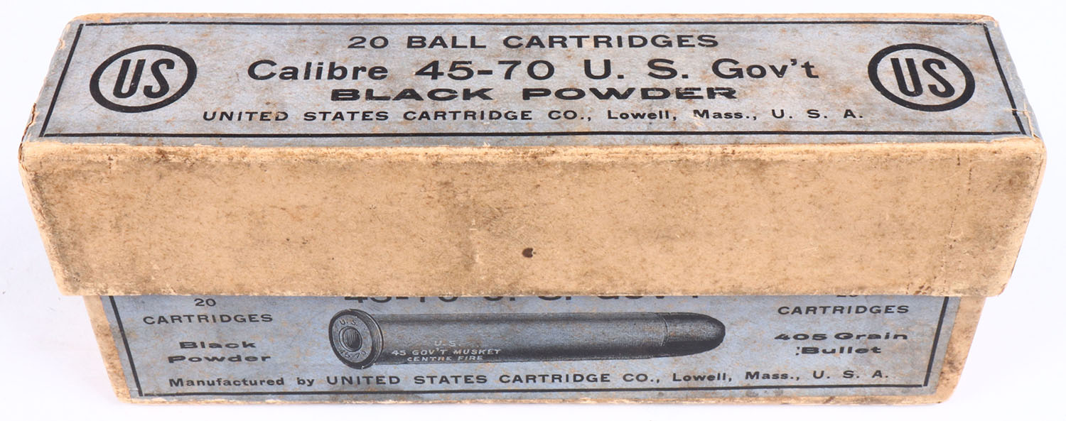 U.S. Cart. Co., ,45-70 U.S. Gov't, black powder, 405 Gr. Bullet, 2pc, Full, buff box with blue label, box is solid with light age soiling, rub marks &, edge wear, ammo is very good. Grade: Very Good ++ - Value: 40 to 80