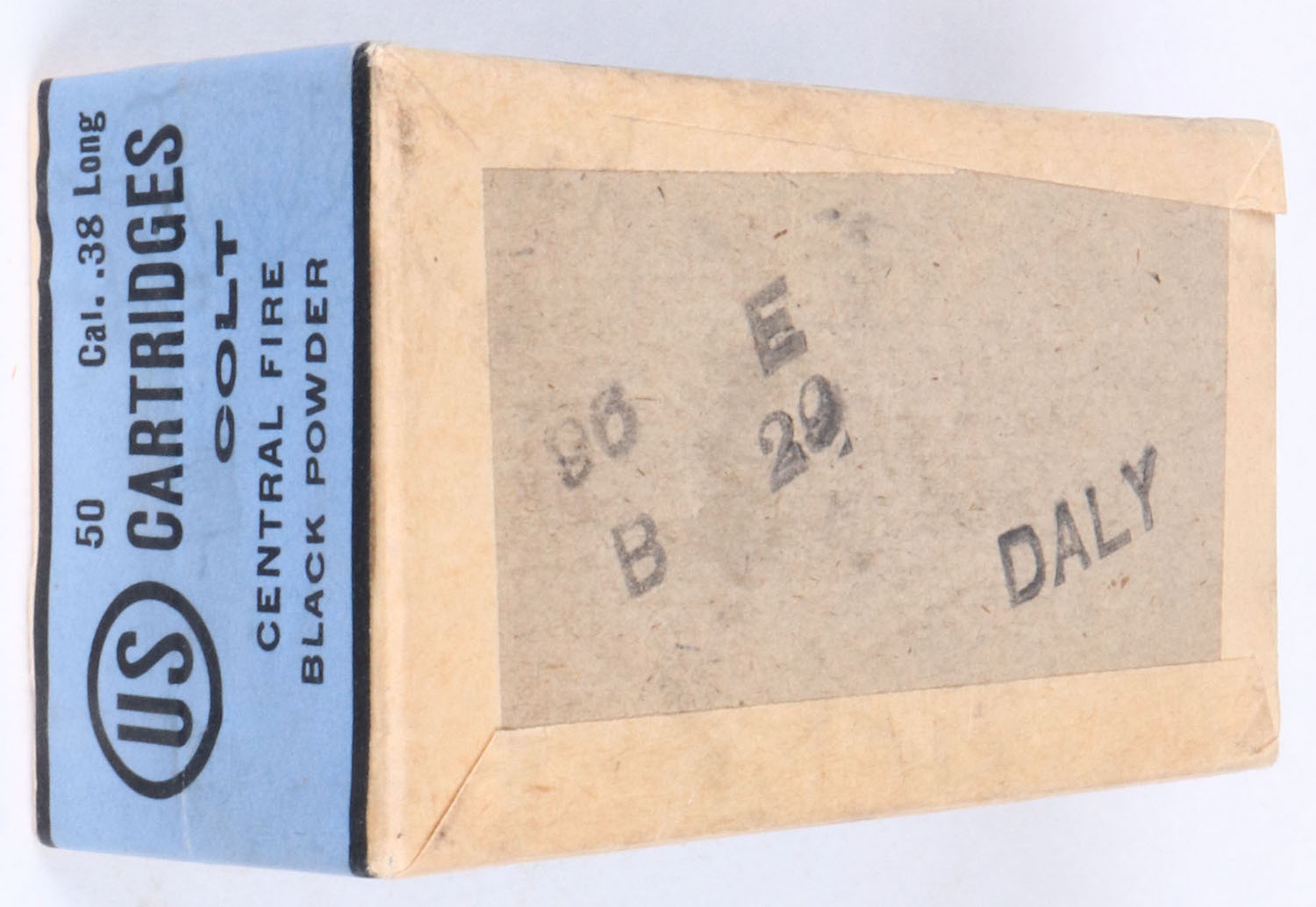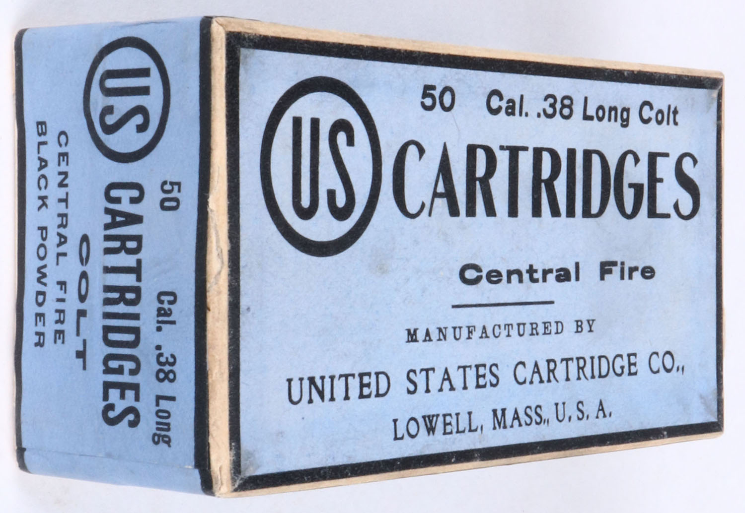 U.S. Cart. Co., .38 Long Colt, black powder, 2pc, FULL & SEALED, buff box with blue label, box is solid with light wear. Grade: Excellent ++ - Value: 50 to 100