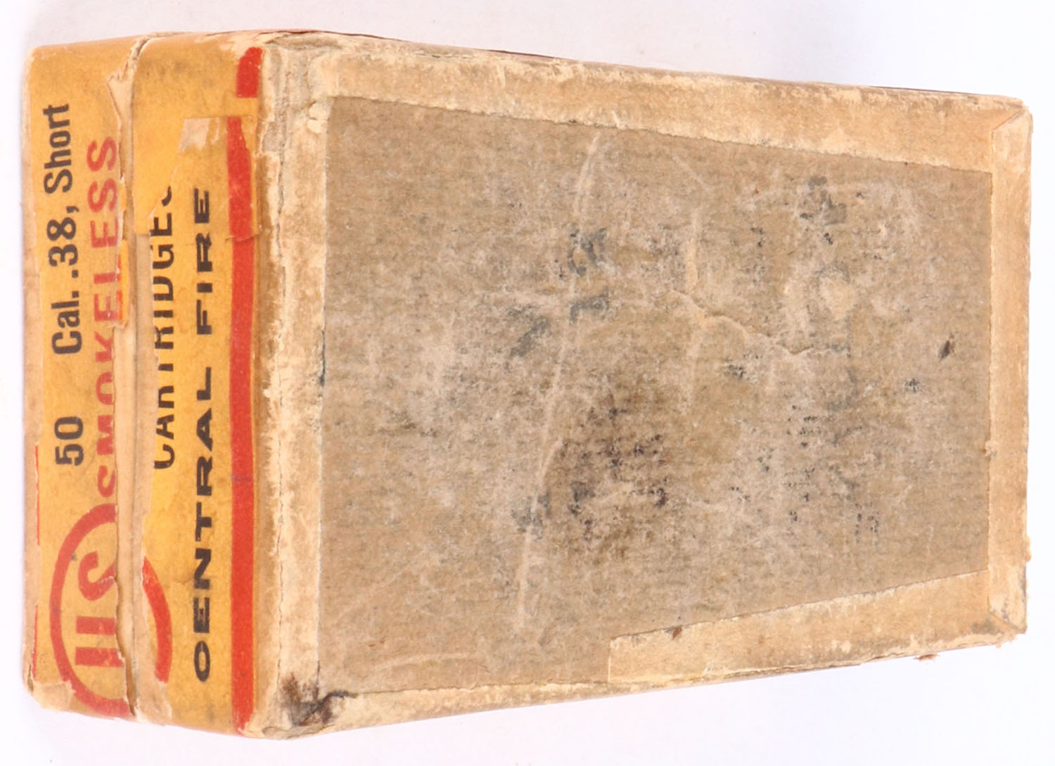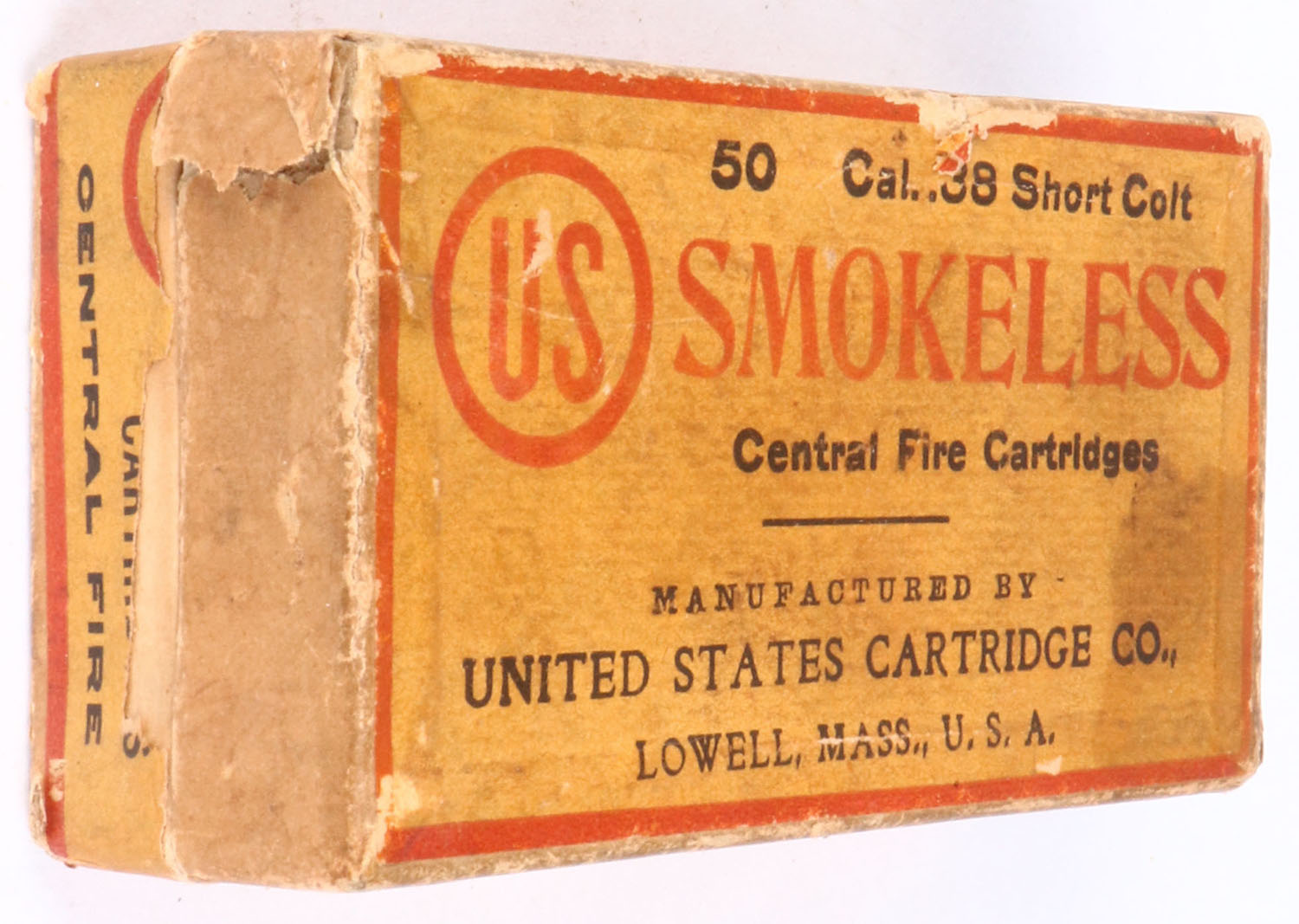 U.S. Cart. Co., .38 Short Colt, Smokeless, 2pc, Full, buff box with orange/red label & black print, box is solid with light age soiling/stains, parts of side labels missing, light rub marks & edge wear. Grade: Very Good + - Value: 30 to 90