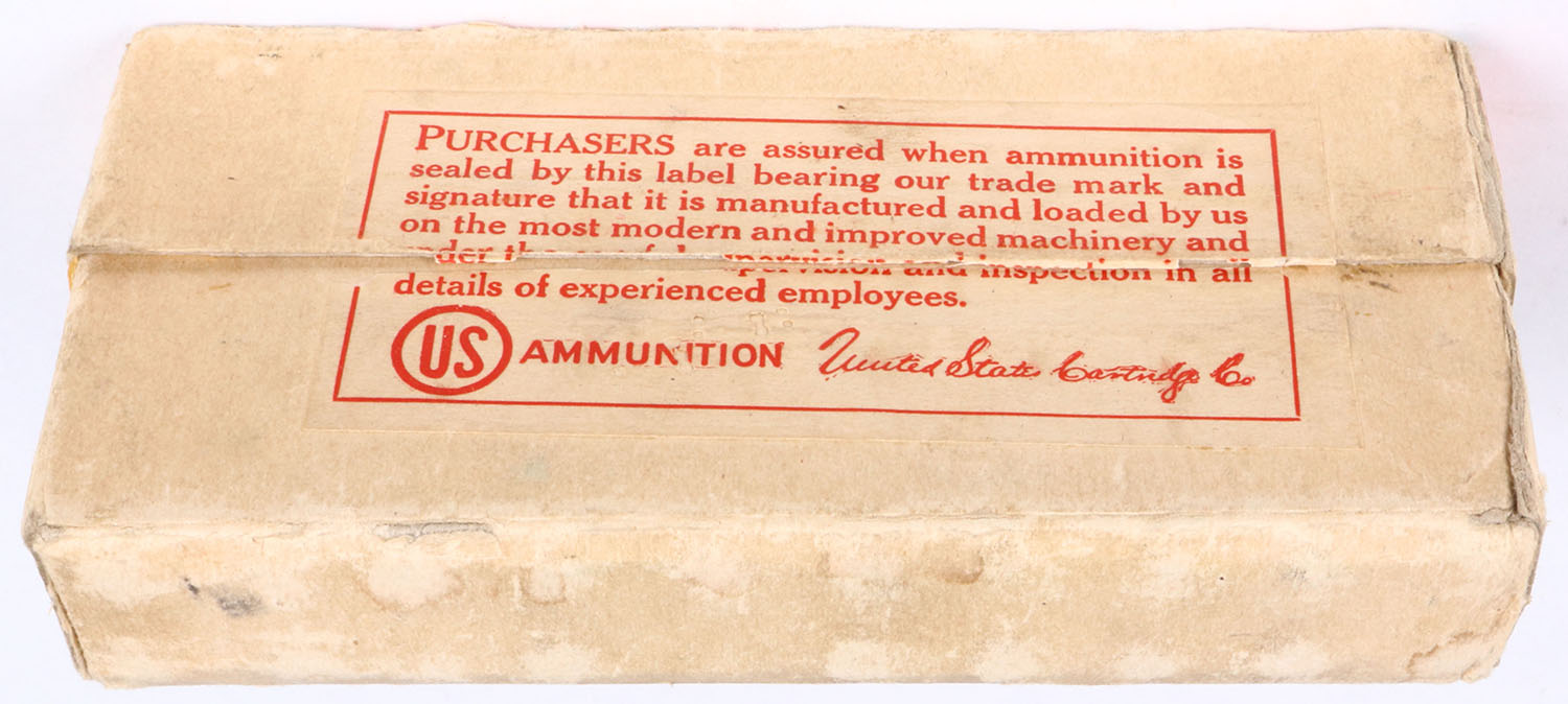 U.S. Cart. Co., .45-70 Winchester, Smokeless, Self-Cleaning, 432 Gr. Soft Point bullet, 2pc, Full, buff box with orange/red label & black print, box is missing right end of lid with tape cover,, light rub marks & edge wear. Grade: Very Good - Value: 30 to 60