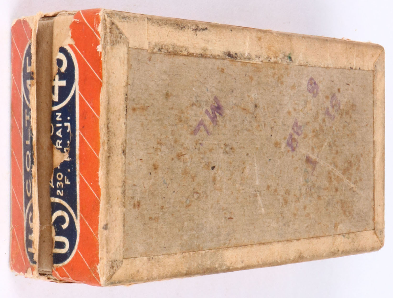 U.S. Cart. Co., .45 Colt Automatic, smokeless, 230 Gr. FMJ , 2pc, Full, buff box with orange/blue label & white print, box is solid with age soiling, pen marks, rub marks & edge wear, ammo is very good. Grade: Very Good + - Value: 30 to 60