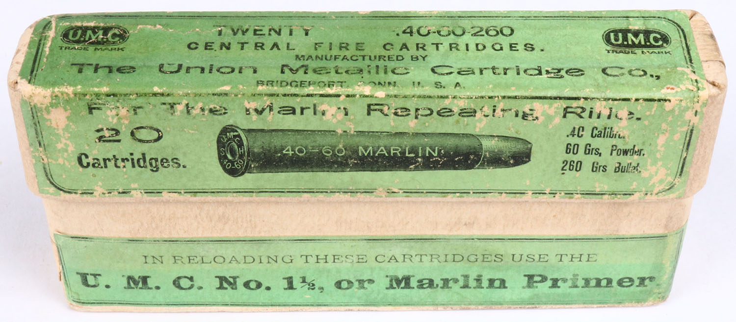 UMC, .40-60 Marlin, 260 Gr. Bullet, 2pc, Full, buff box with green label & black print, box is solid with light age spotting, light rub marks, & light edge wear. Grade: Excellent - Value: 50 to 100