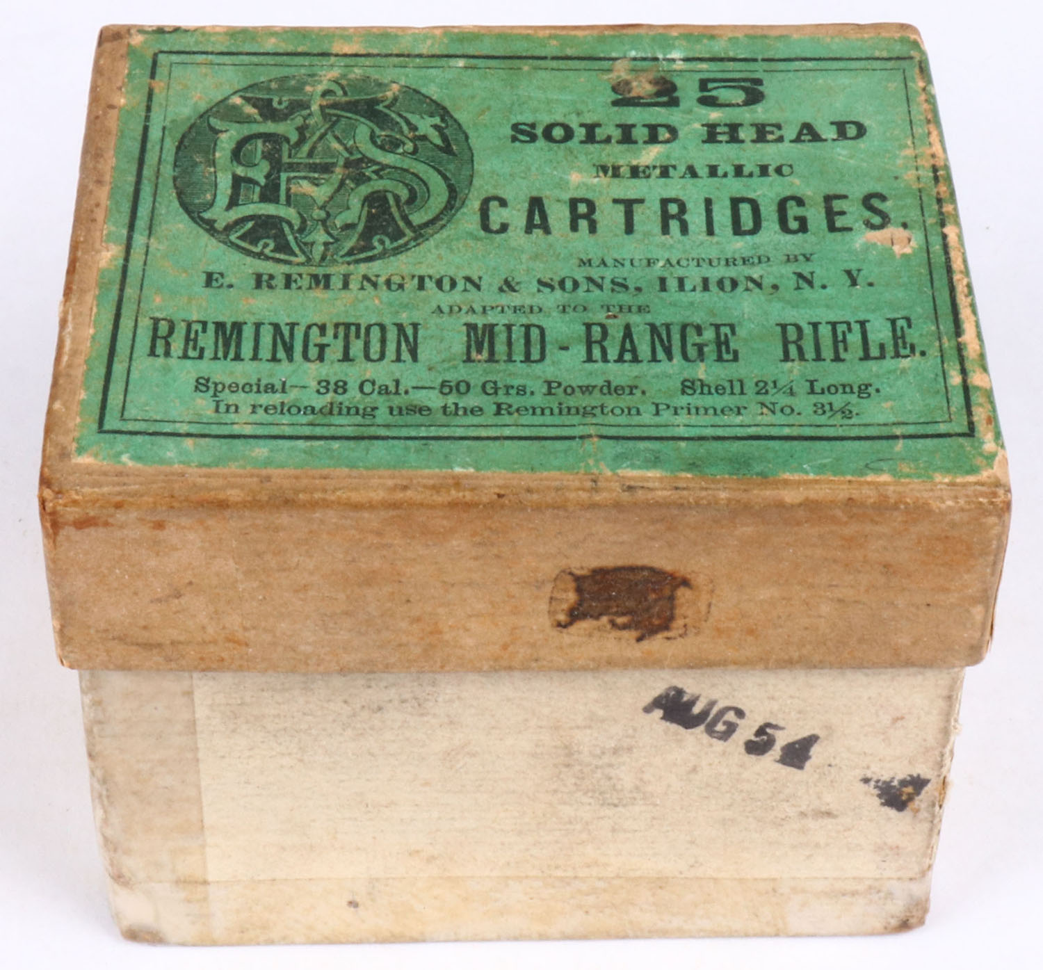 E. Remington & Sons, .38-50, 2 1/4'' long shell, 2pc, Partial 22 Rds., buff box with green label & black print, box is solid with rub marks, & light edge wear, ammo is very good to good. Grade: Excellent - Value: 50 to 200