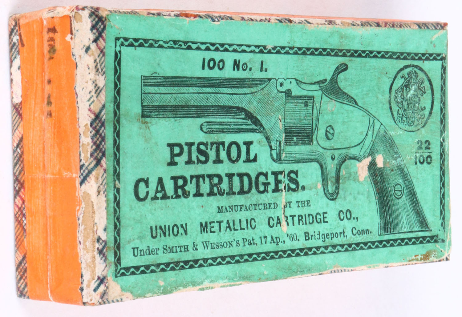 UMC, .22/100 (.22 short) No.1, dog head logo, 2pc, empty, fabric box with green/orange label & black print, box is solid with on side seal still intact, light rub marks, & light edge wear. Grade: Excellent - Value: 50 to 200