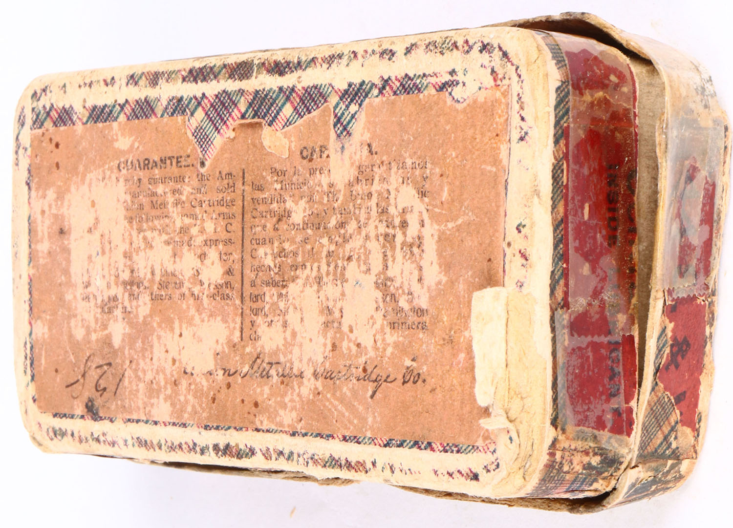 UMC, .44 S&W Russian, 23 Grs Powder, 246 Grs. Bullet, 2pc, partial 48 Rds. With all Rem-UMC H/S, fabric box with blue/red label & black print, box is weak with multiple seam splits & tears in box, sticker marks, rub marks, light edge wear, ammo is very good. Grade: Good + - Value: 40 to 300