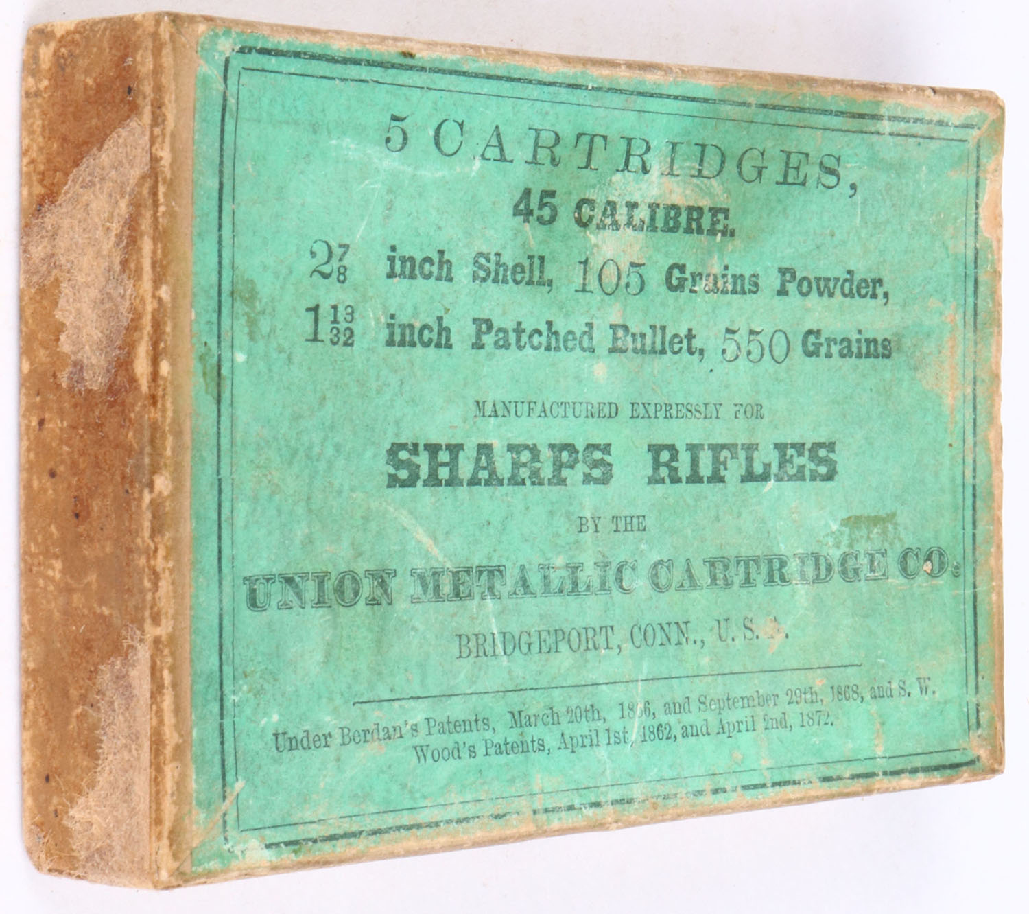 UMC, .45-105 For Sharps Rifles, 550 Gr. Bullet, 2pc, Full, buff box with green label & black print, box is solid with rub marks & edge wear, ammo is very good. Grade: Excellent - Value: 300 to 1200