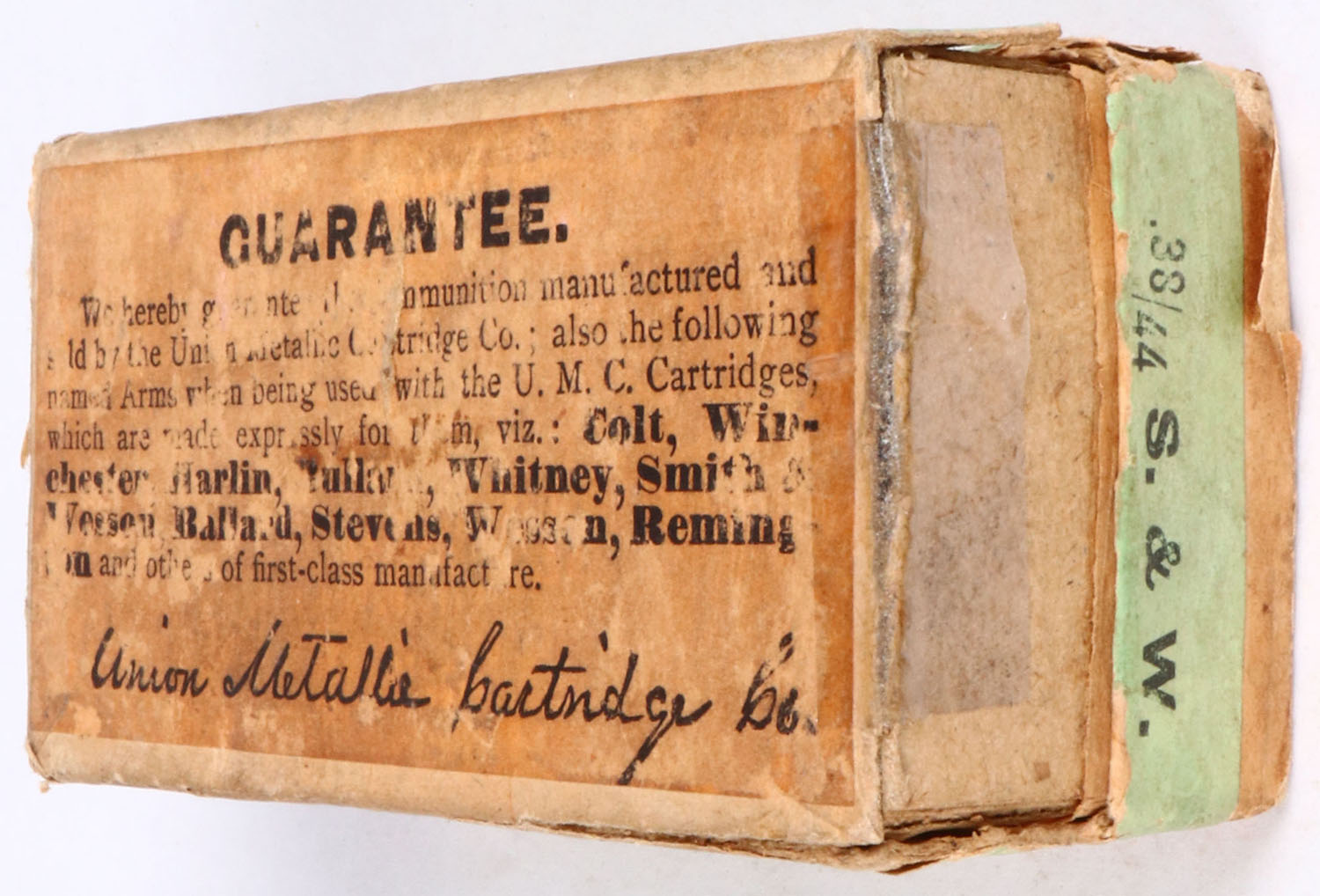 RARE!! UMC, .38-44 S&W, Bullet, 2pc, Full but some rounds are primed with no bullet & powder, buff box with green label & black print, box is missing right end on bottom box, partial seam split on lid, rub marks & edge wear, ammo is very good. Grade: Excellent - Value: 100 to 1000