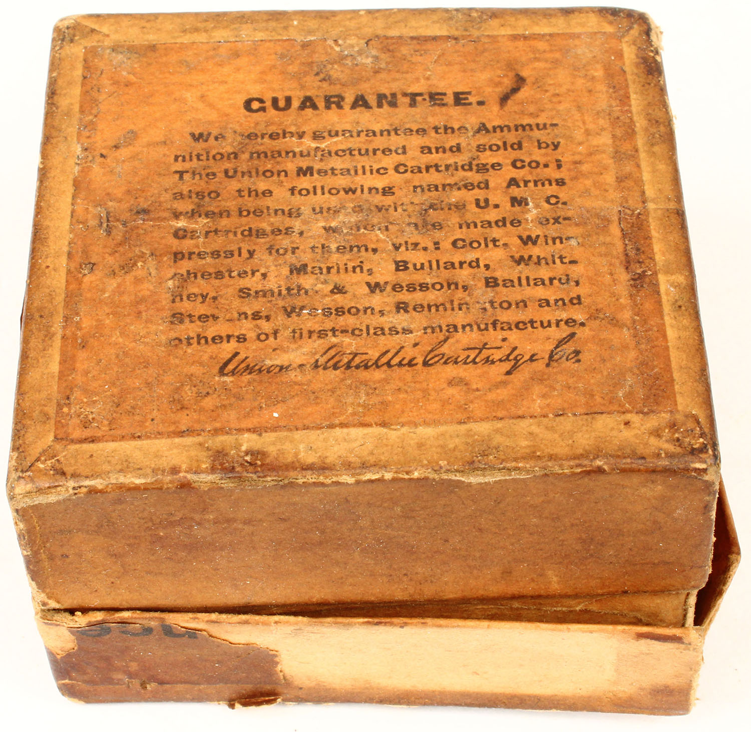 UMC, .56-52 Spencer, 2pc, Full, buff box & label with black print, box has one split corner seam & one partial split seam on lid, age soiling, color fading, small parts of label missing, rub marks, & edge wear, ammo is very good. Grade: Very Good + - Value: 100 to 300