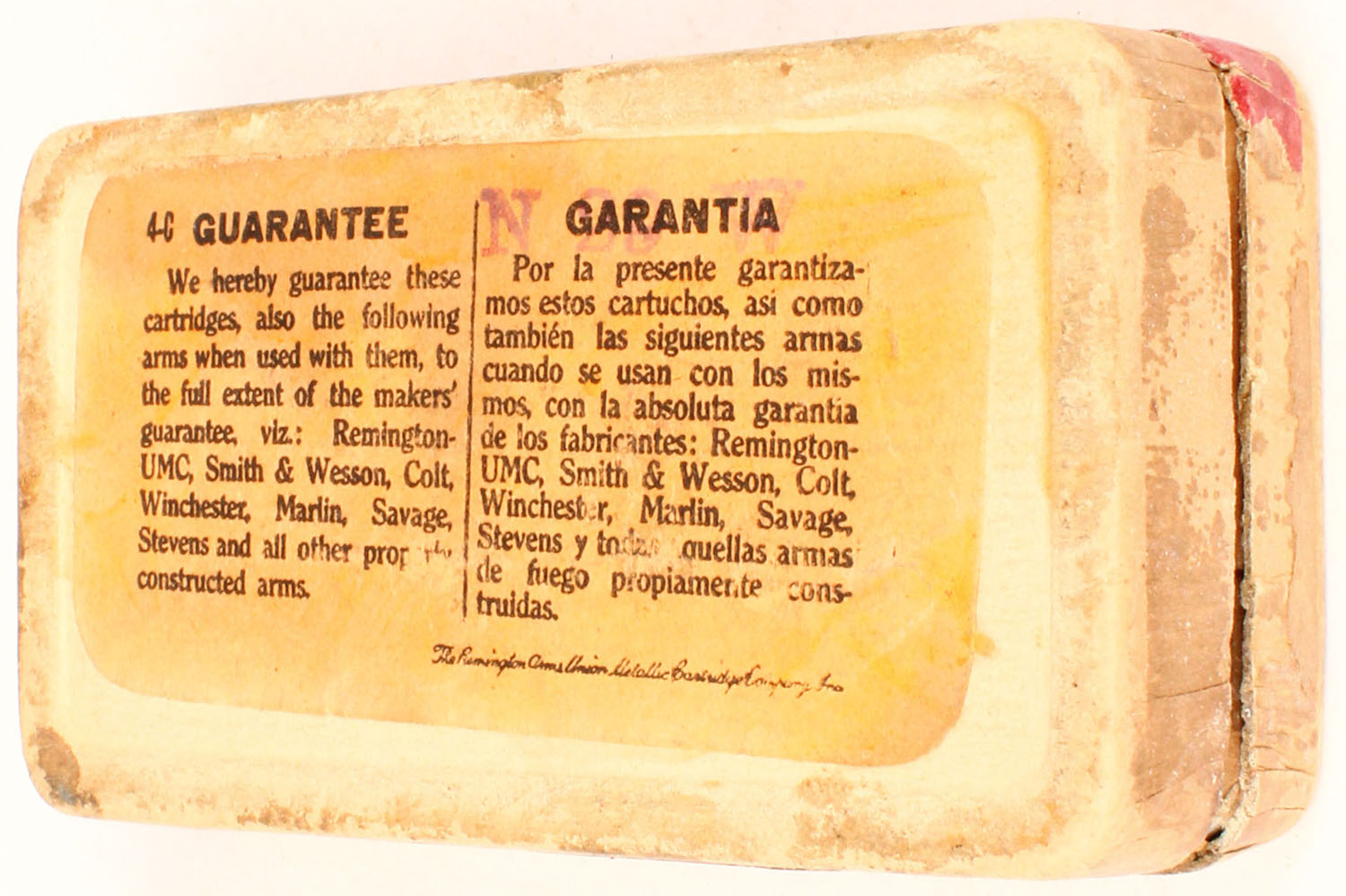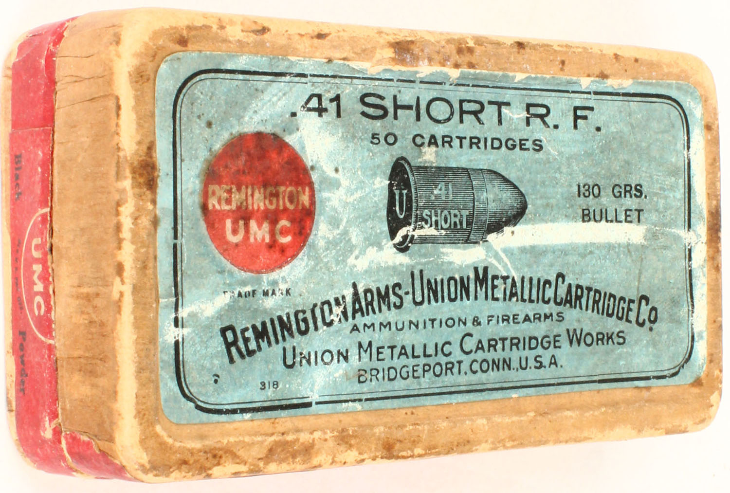 REM-UMC, .41 Short R.F., black powder, 130 Gr. bullet, 2pc, Full, buff box with blue/red label & black print, box is solid with rub marks, parts of side labels missing, light age soiling, & edge wear, ammo is good. Grade: Very Good + - Value: 100 to 300