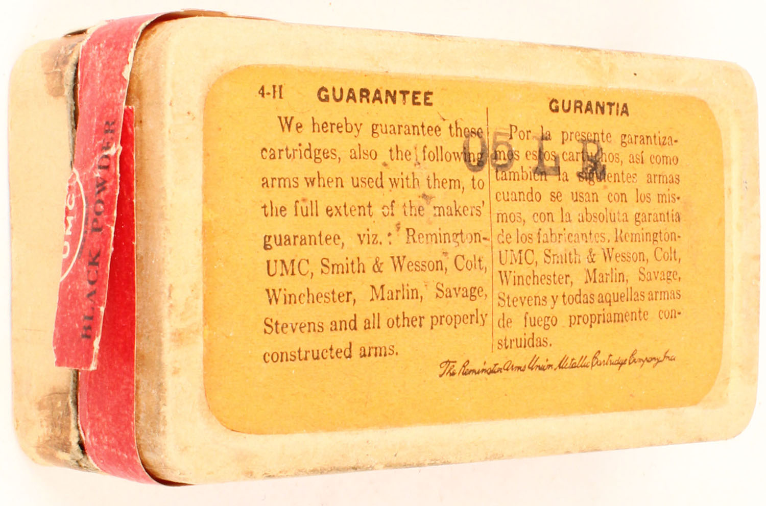 REM-UMC, .38 Short R.F., black powder, 125 Gr. bullet, 2pc, Full, buff box with blue/red label & black print, box is solid with tape on box, rub marks, parts of side labels missing, light stain, & edge wear, ammo is very good. Grade: Very Good + - Value: 30 to 90