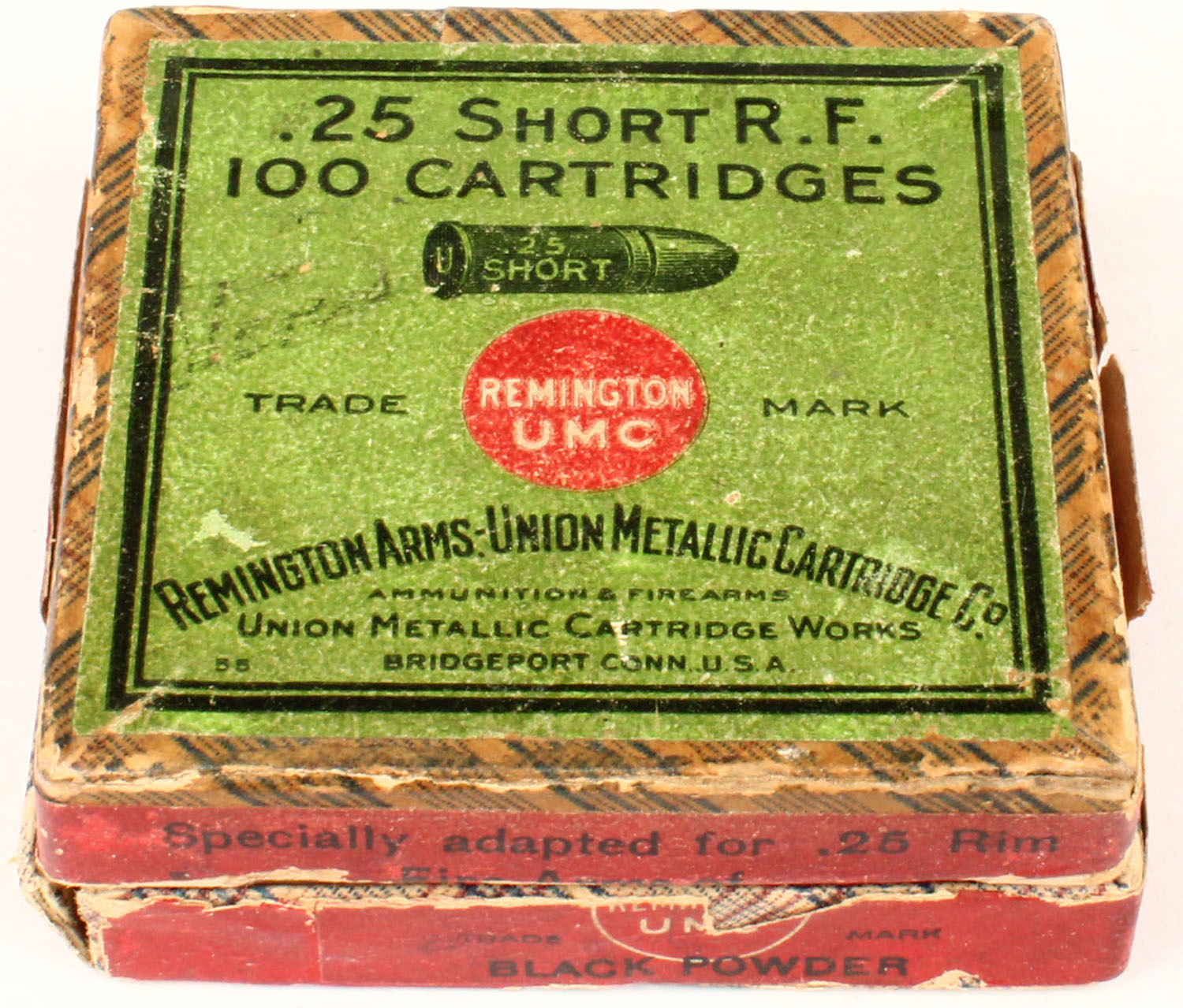 REM-UMC, .25 Short R.F., Black Powder, 2pc, Full, fabric box with green/red label & black print, box is solid with light age soiling, rub marks, light edge wear & light corner wear, ammo is very good. Grade: Excellent - Value: 50 to 150
