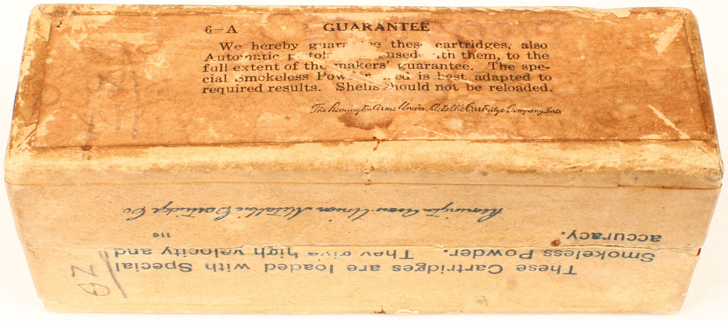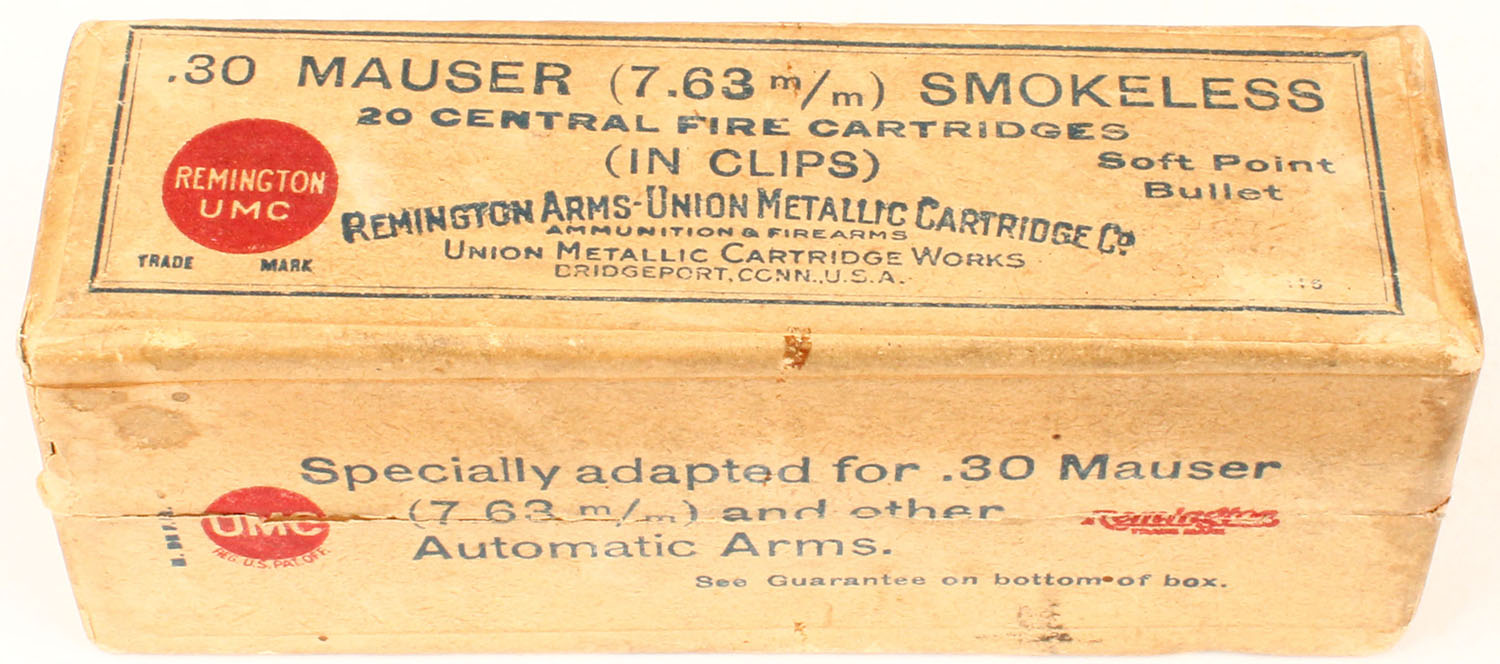 REM-UMC, .30 Mauser (7.63mm), smokeless, 2pc, Full with 20 Rds on clips, buff box & label with black/red print, box is solid with minor age soiling, light rub marks, & light edge wear, ammo is excellent. Grade: Excellent - Value: 20 to 60
