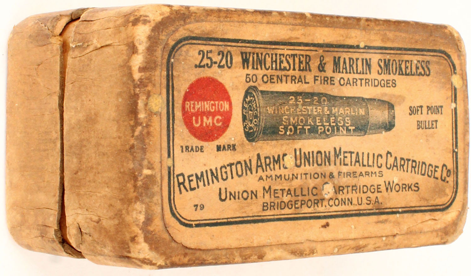 REM-UMC, .25-20 Winchester & Marlin, smokeless, soft point bullet, 2pc, Full, buff box & label with black/red print, box is solid with light age soiling, light rub marks, & light edge wear, ammo is excellent. Grade: very good ++ - Value: 30 to 90