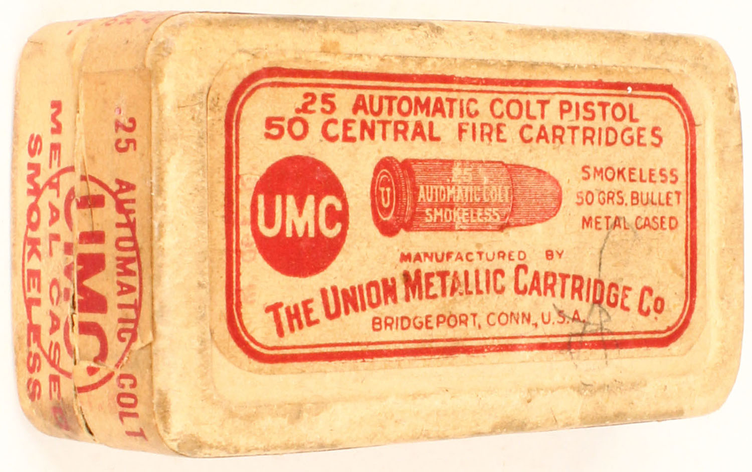 UMC, .25 automatic colt pistol, smokeless, 50 Grs. bullet 2pc, Full, buff box & label with red print, box is solid with minor age soiling, rub marks, & light edge wear, ammo is excellent. Grade: Very Good ++ - Value: 20 to 40