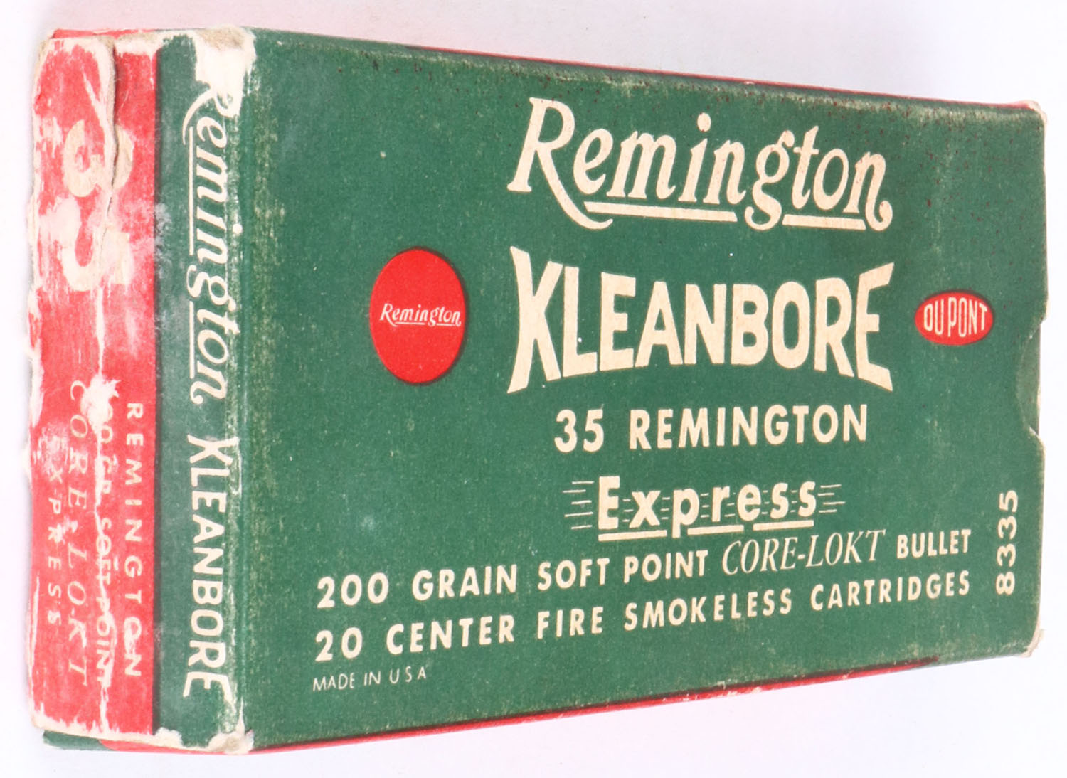Remington, Kleanbore, .35 Remington, Express, 200 Gr. Soft point core-Lokt bullet, 1pc, Full, green/red box with white print, box is solid with excellent color, minor rub wear, & minor edge wear, ammo is excellent. Grade: Excellent + - Value: 50 to 200