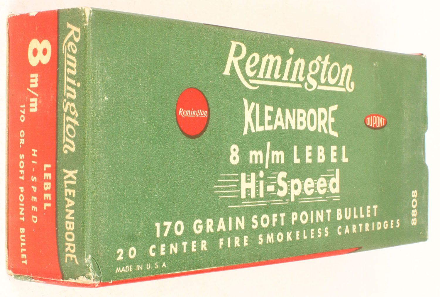 Remington, Kleanbore, 8mm Lebel, Hi-Speed, 270 Gr. Soft point bullet, 1pc, Full, green/red box with white print, box is solid with minor rub marks, & minor edge wear, ammo is excellent. Grade: Excellent + - Value: 20 to 60