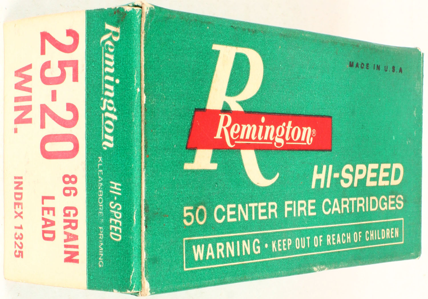 Remington, .25-20 Win., 86 Gr. PTD lead Bullet, 1pc, Full, green/white box with red/white print, box is solid with minor rub marks, & minor edge wear, ammo is excellent. Grade: Excellent + - Value: 100 to 200