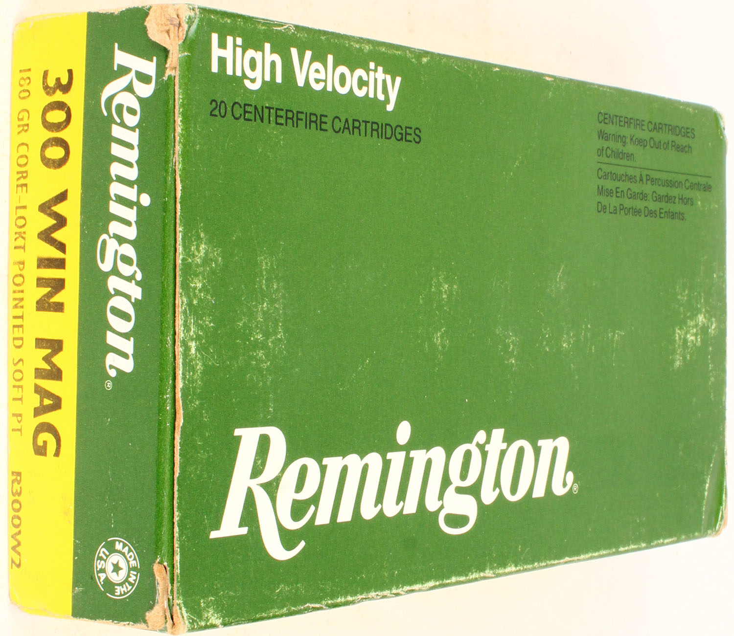 Remington, High Velocity, .300 Win. Mag., 180 Gr. Core-Lokt Pointed soft PT bullet, 1pc, Full, green/yellow box with white/black print, box is solid with, minor rub marks & minor edge wear, ammo is Excellent. Grade: Excellent ++ - Value: 30 to 60