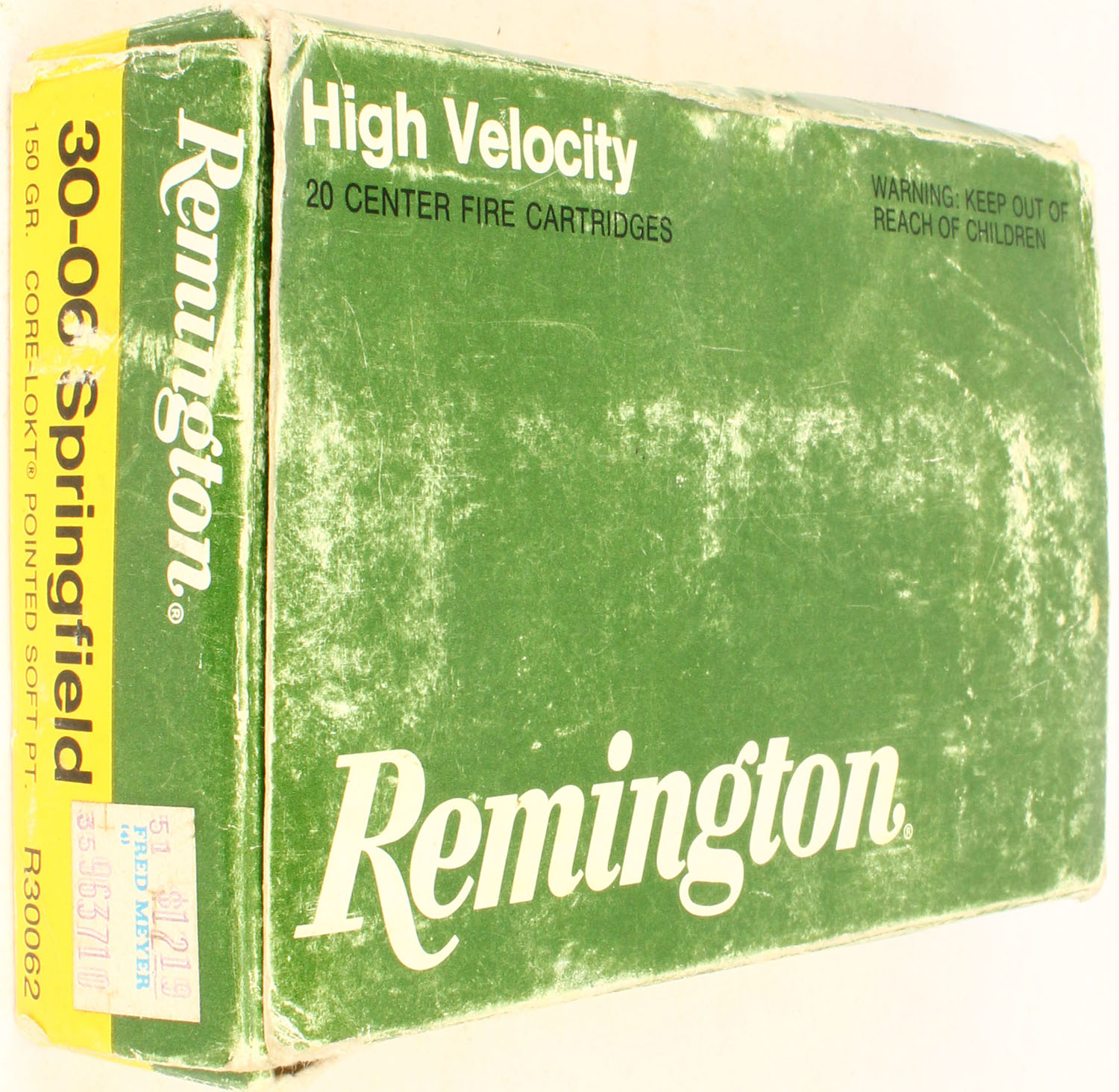 Remington, High Velocity, .30-06 Springfield, 150 Gr. Core-Lokt Pointed soft PT bullet, 1pc, Full, green/yellow box with white/black print, box is solid with handling wear, heavy rub marks & edge wear, ammo is Excellent. Grade: Very Good + - Value: 20 to 60