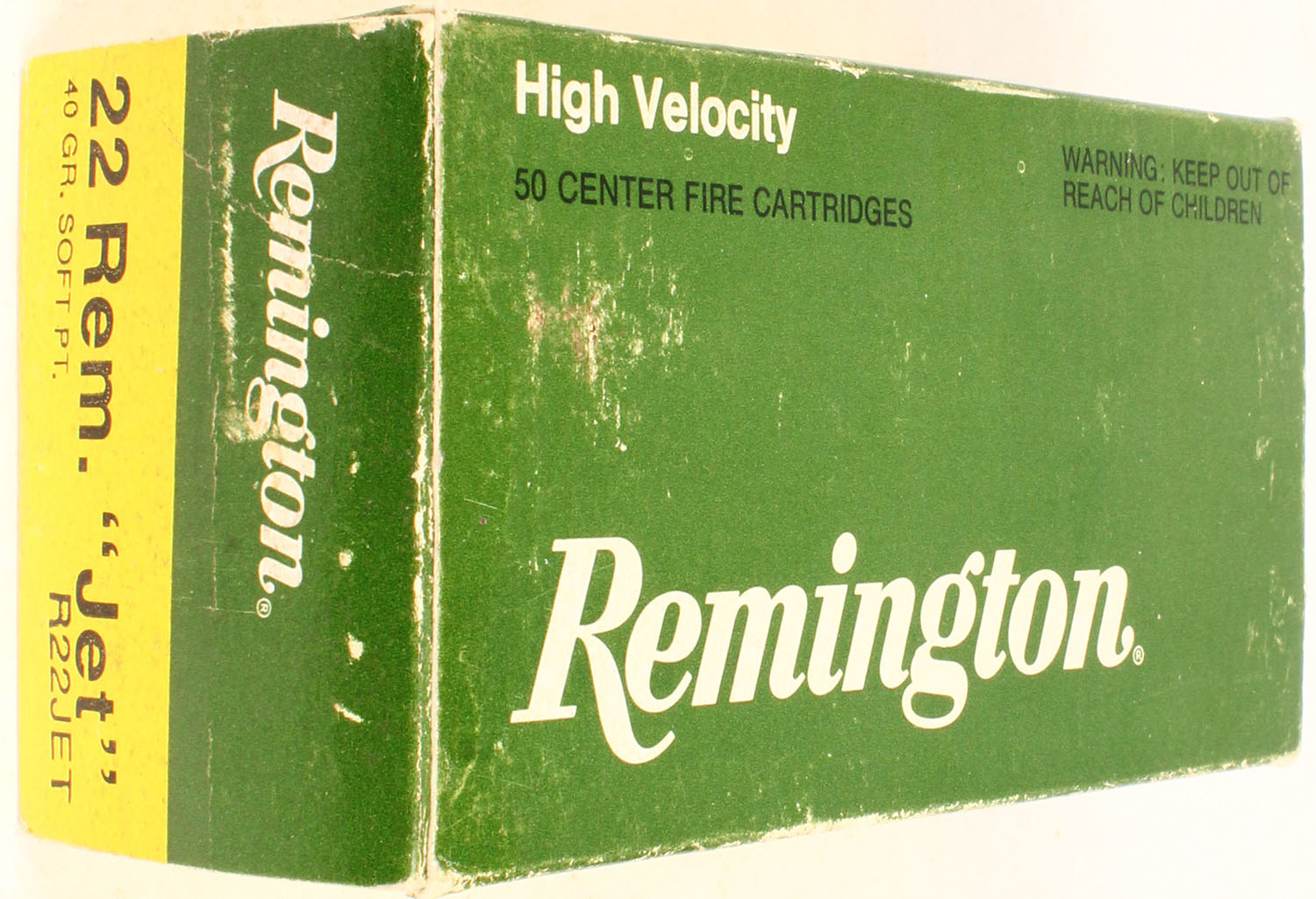 Remington, .22 Rem ''Jet'', High Velocity, 40 Gr Soft PT, 1pc, Full, green/yellow box with black/white print, box is solid with light rub marks, ammo is excellent. Grade: Excellent - Value: 20 to 60