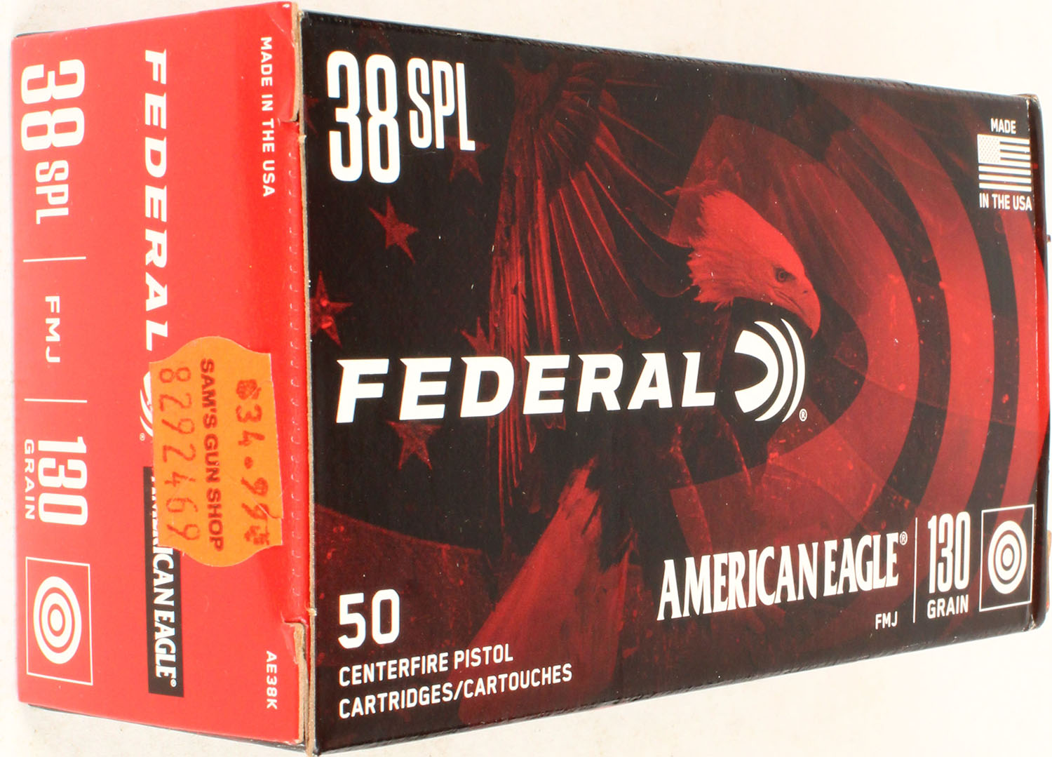 Federal, American Eagle, 38 SPL FMJ, 130 Grain, Full, 1pc. multi-colored box, box is solid with excellent color, Ammo is excellent. Grade: Excellent - Value: 20 to 60