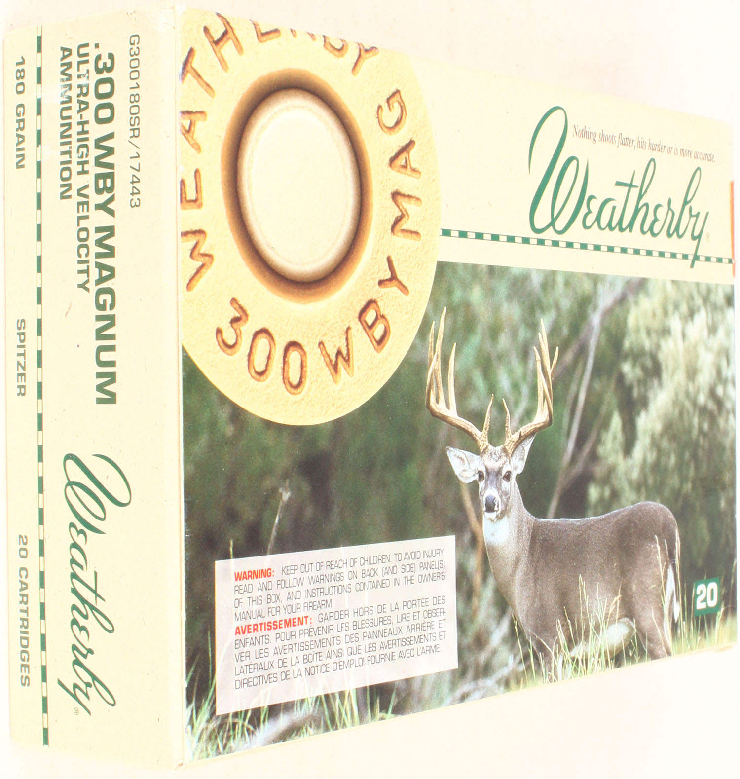 Weatherby, 300 WBY Magnum, 180 Grain Ultra-High Velocity Spitzer, Full, 1pc. multi-colored box, box is solid with excellent color, Ammo is excellent. Grade: Excellent - Value: 20 to 60