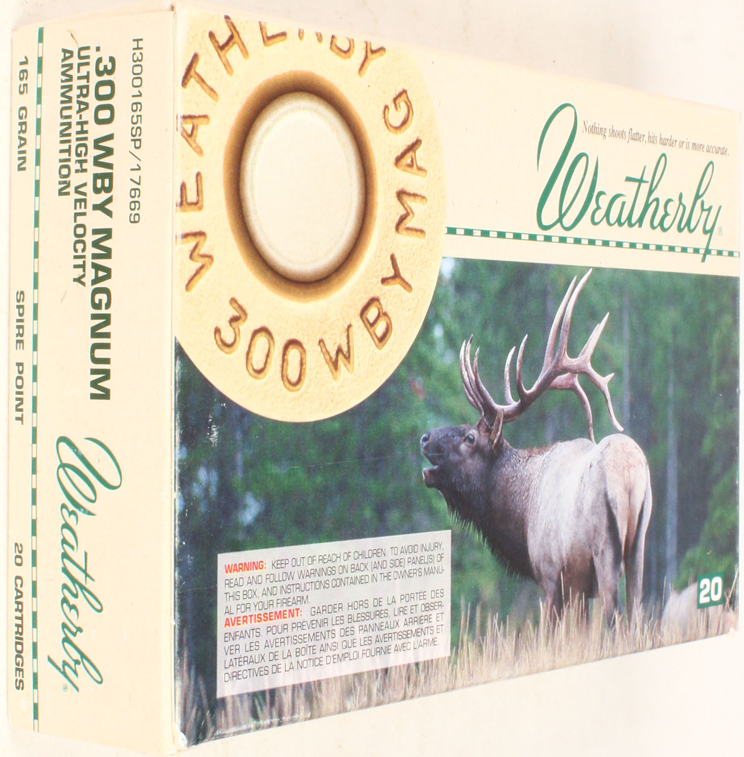 Weatherby, 300 WBY Magnum, 165 Grain Ultra-High Velocity Spire Point, Full, 1pc. multi-colored box, box is solid with excellent color, Ammo is excellent. Grade: Excellent - Value: 20 to 60