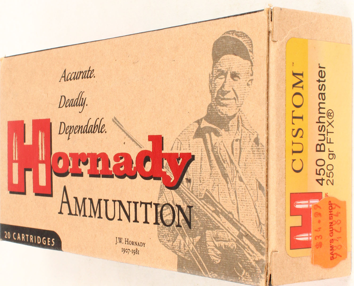 Hornady, CUSTOM, 450 Bushmaster, 250 Grain FTX, Full, 1pc. multi-colored box, box is solid with excellent color, Ammo is excellent. Grade: Excellent - Value: 20 to 60