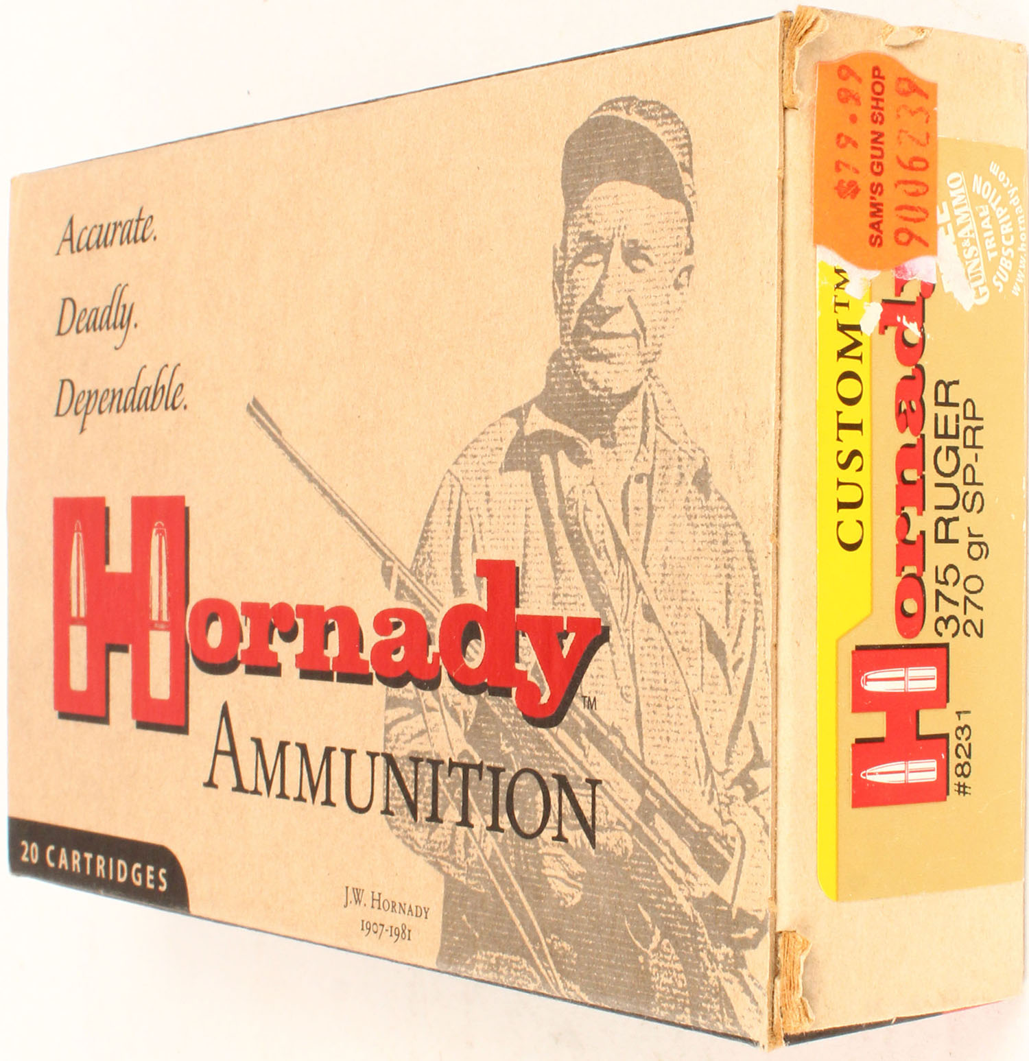Hornady, CUSTOM, 375 Ruger, 270 Grain SP-RP, Full, 1pc. multi-colored box, box is solid with excellent color, Ammo is excellent. Grade: Excellent - Value: 20 to 60