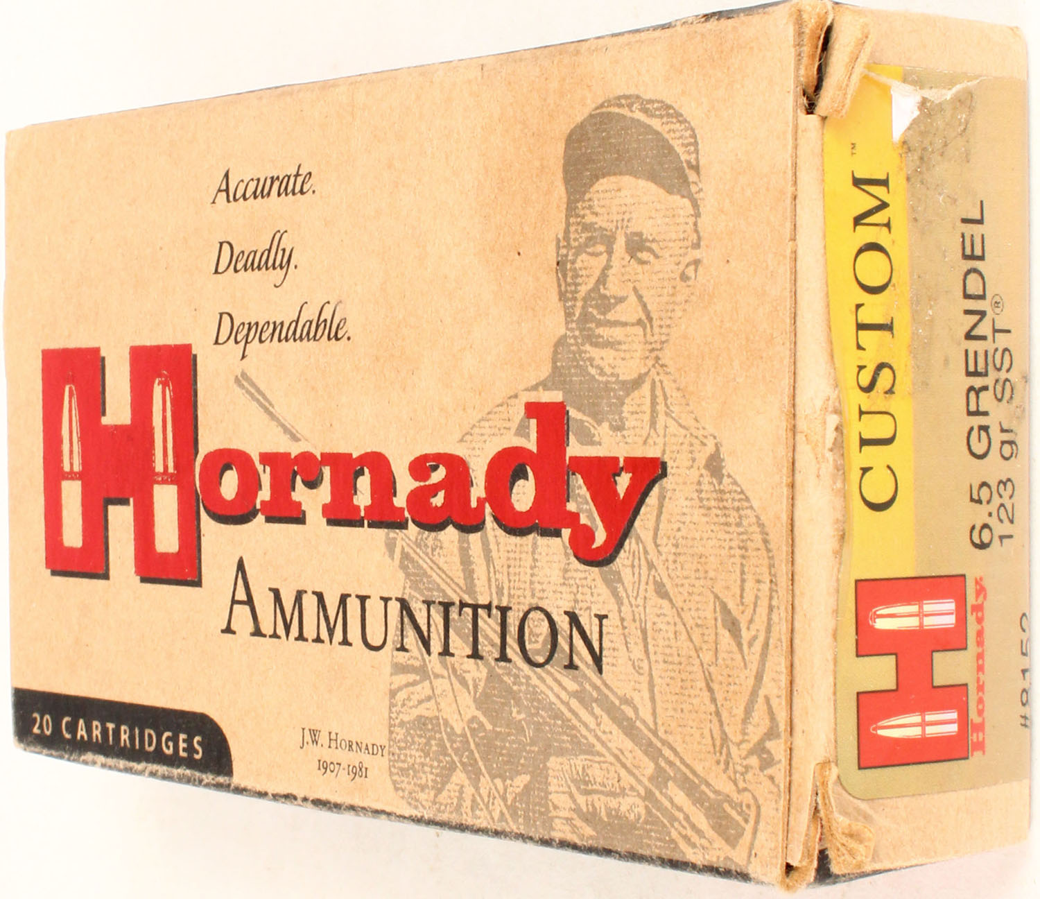 Hornady, CUSTOM, 6.5 Grendel, 123 Grain SST, Full, 1pc. multi-colored box, box is solid with excellent color, Ammo is excellent. Grade: Excellent - Value: 20 to 60