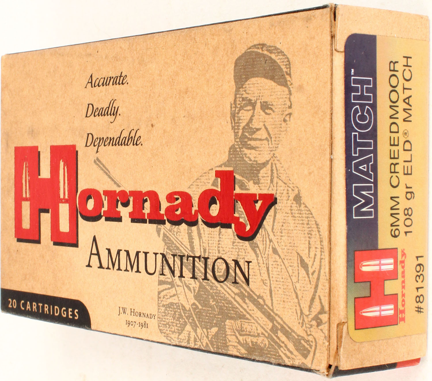 Hornady, MATCH, 6mm Creedmoor, 108 Grain ELD, Full, 1pc. multi-colored box, box is solid with excellent color, Ammo is excellent. Grade: Excellent - Value: 20 to 60