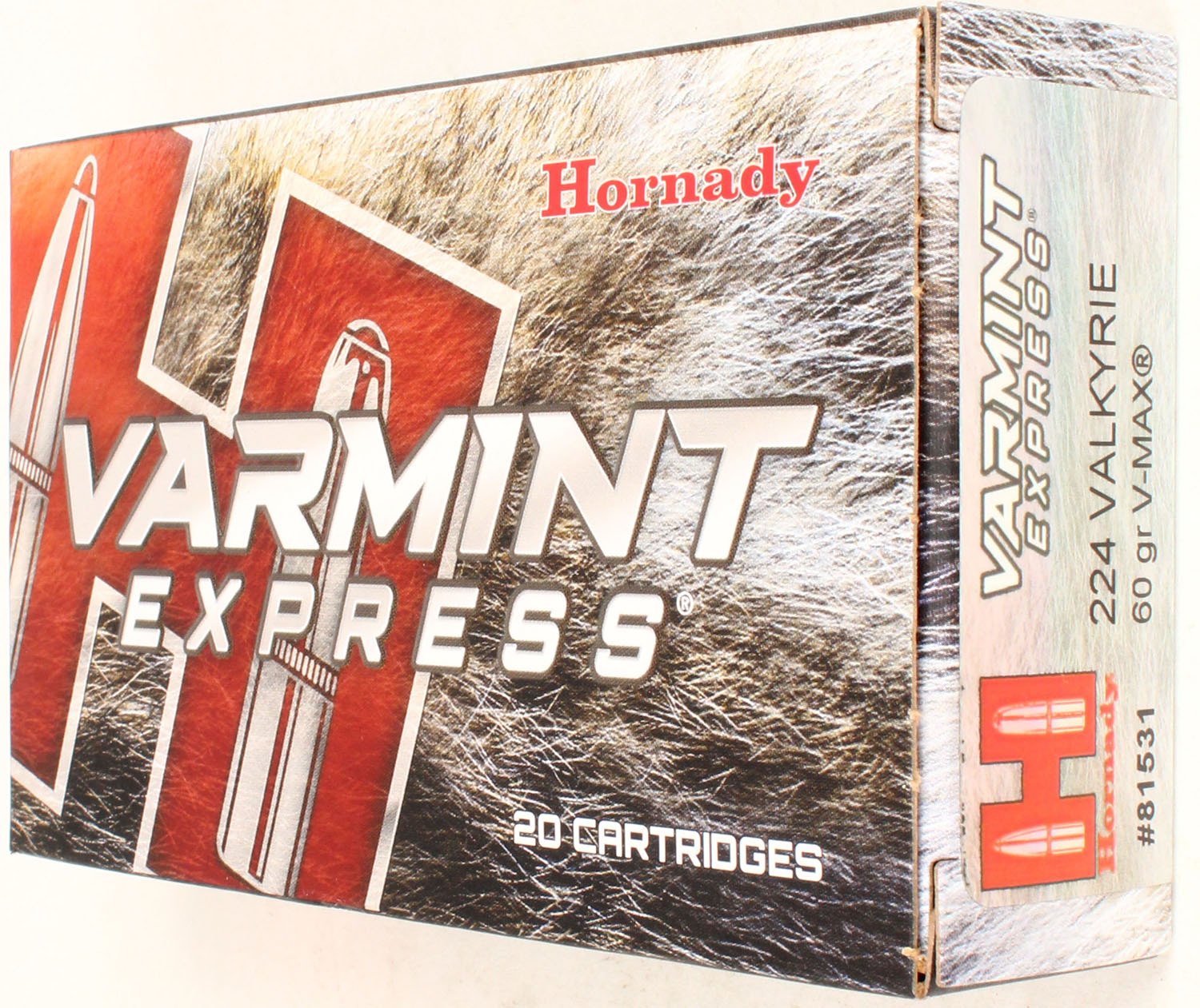 Hornady, Varmint Express, 224 Valkyrie, 60 Grain V-Max, Full, 1pc. multi-colored box, box is solid with excellent color, Ammo is excellent. Grade: Excellent - Value: 20 to 60