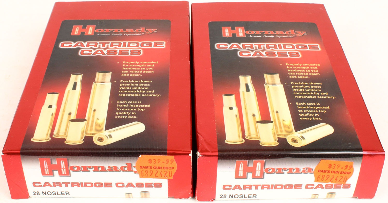 Lot of 2 Hornady, Unprimed Cartridge Cases, 28 Nosler, Full, 1pc. multi-colored box, box is solid with excellent color, Ammo is excellent. Grade: Excellent - Value: 20 to 60