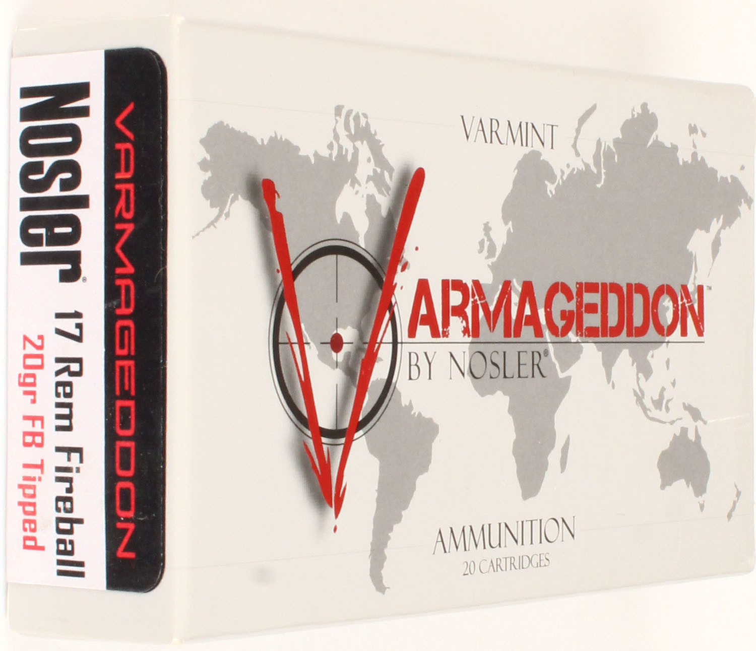 Varmegeddon, .17 Rem Fireball, 20gr. FB tipped, Full, 1pc. multi-colored box, Ammo is excellent. Grade: Excellent ++ - Value: 16 to 50