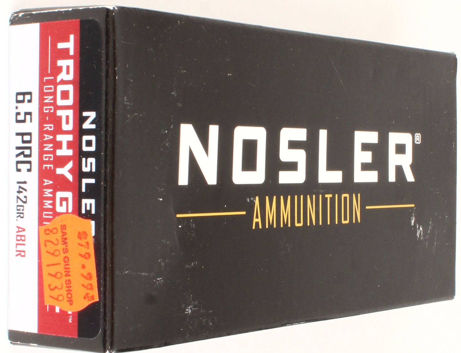 Nosler, Trophy Grade, 6.5 PRC, 142 Grain ABLR, Full, 1pc. multi-colored box, box is solid, with excellent color, Ammo is excellent. Grade: Excellent ++ - Value: 20 to 50