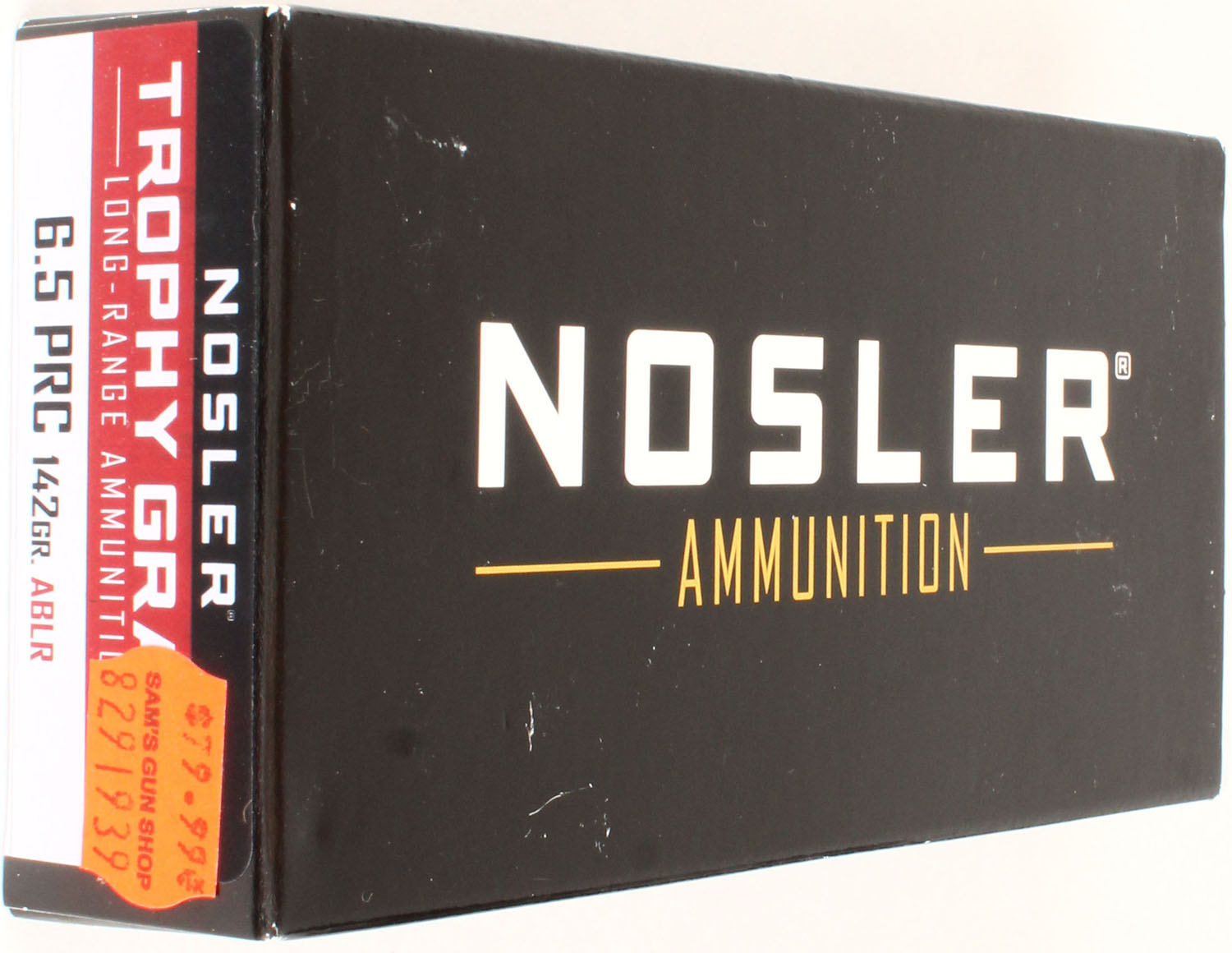 Nosler, Trophy Grade, 6.5 PRC, 142 Grain ABLR, Full, 1pc. multi-colored box, box is solid, with excellent color, Ammo is excellent. Grade: Excellent ++ - Value: 20 to 50