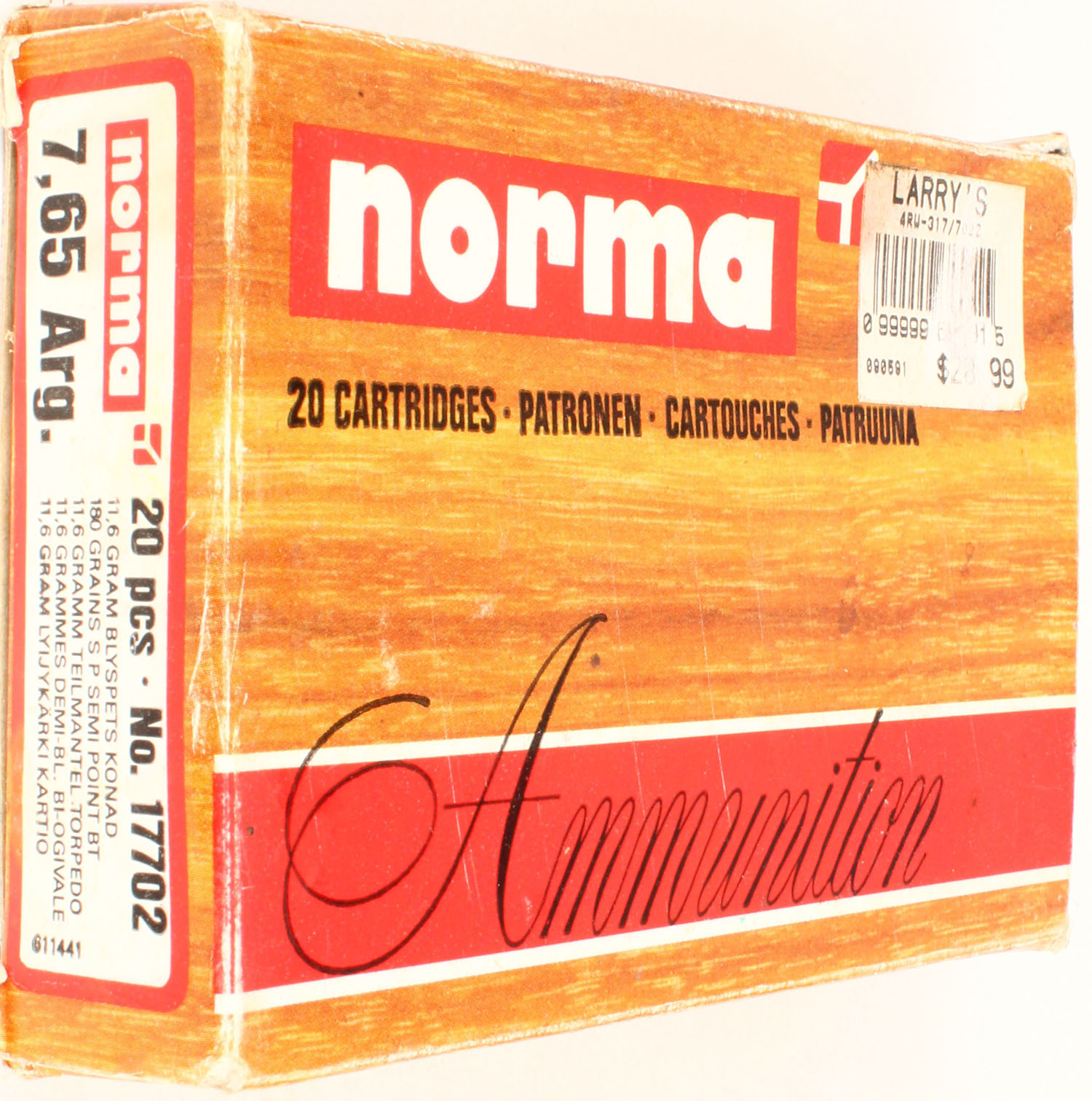 Norma 7.65 ARG., Full, 1pc. multi-colored box, Ammo is excellent. Grade: Excellent - Value: 16 to 50