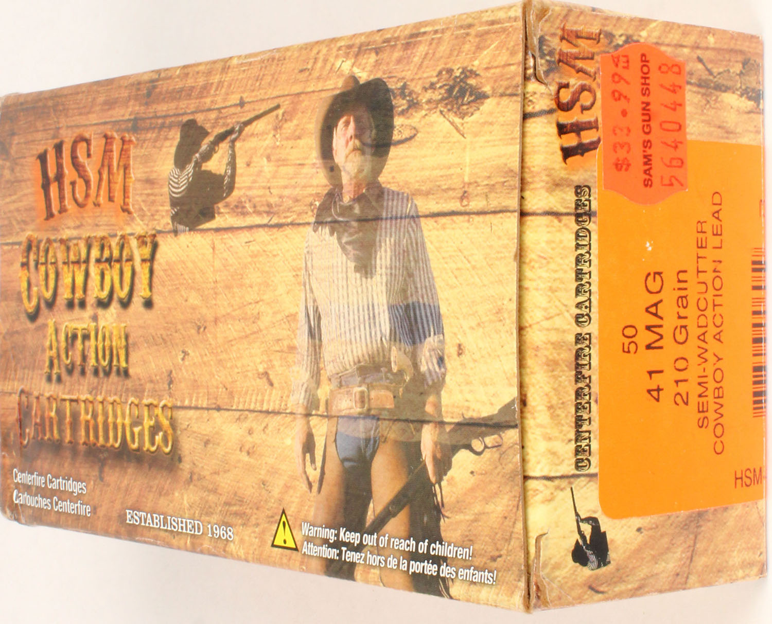 HSM, .41 mag, 210 Grain semi-wadcutter cowboy action lead, Full, 1pc. multi-colored box, box is solid, with excellent color, Ammo is excellent. Grade: Excellent ++ - Value: 20 to 80