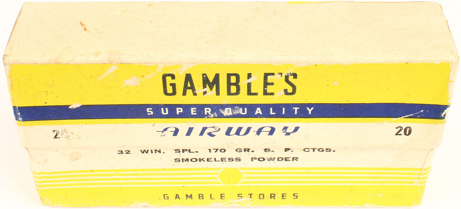 Gambles Airway, .32 win spl., 170 grs., FULL & SEALED, 2pc. multi-colored box, box is solid, with excellent color. Grade: Excellent - Value: 20 to 80