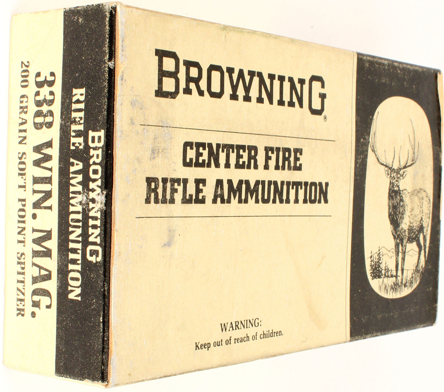 Browning, .338 Win Mag., 200 Grain Soft Point Spitzer, Full, 1pc. multi-colored box, box is solid, light shelf wear, Ammo is excellent. Grade: Very Good ++ - Value: 30 to 60