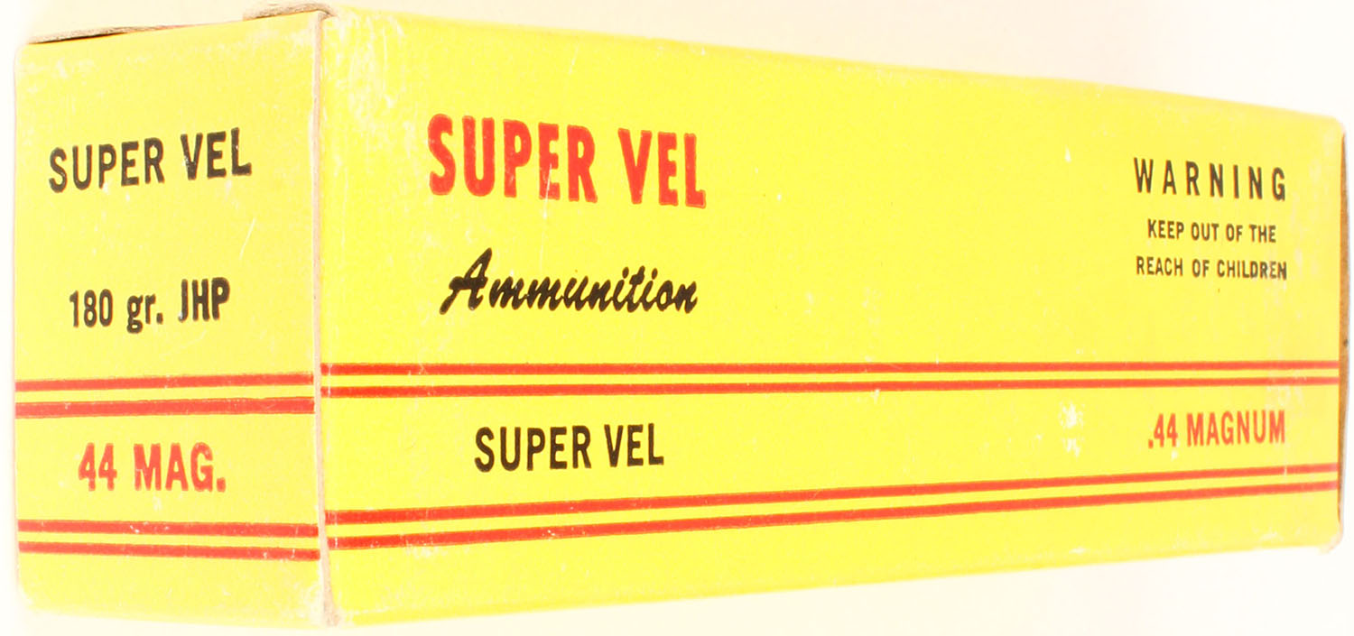 Super-Vel, .44 mag, 180 Grain JHP, Full, 1pc. multi-colored box, box has 1 corner ding, with excellent color, Ammo is excellent. Grade: Excellent - Value: 20 to 80