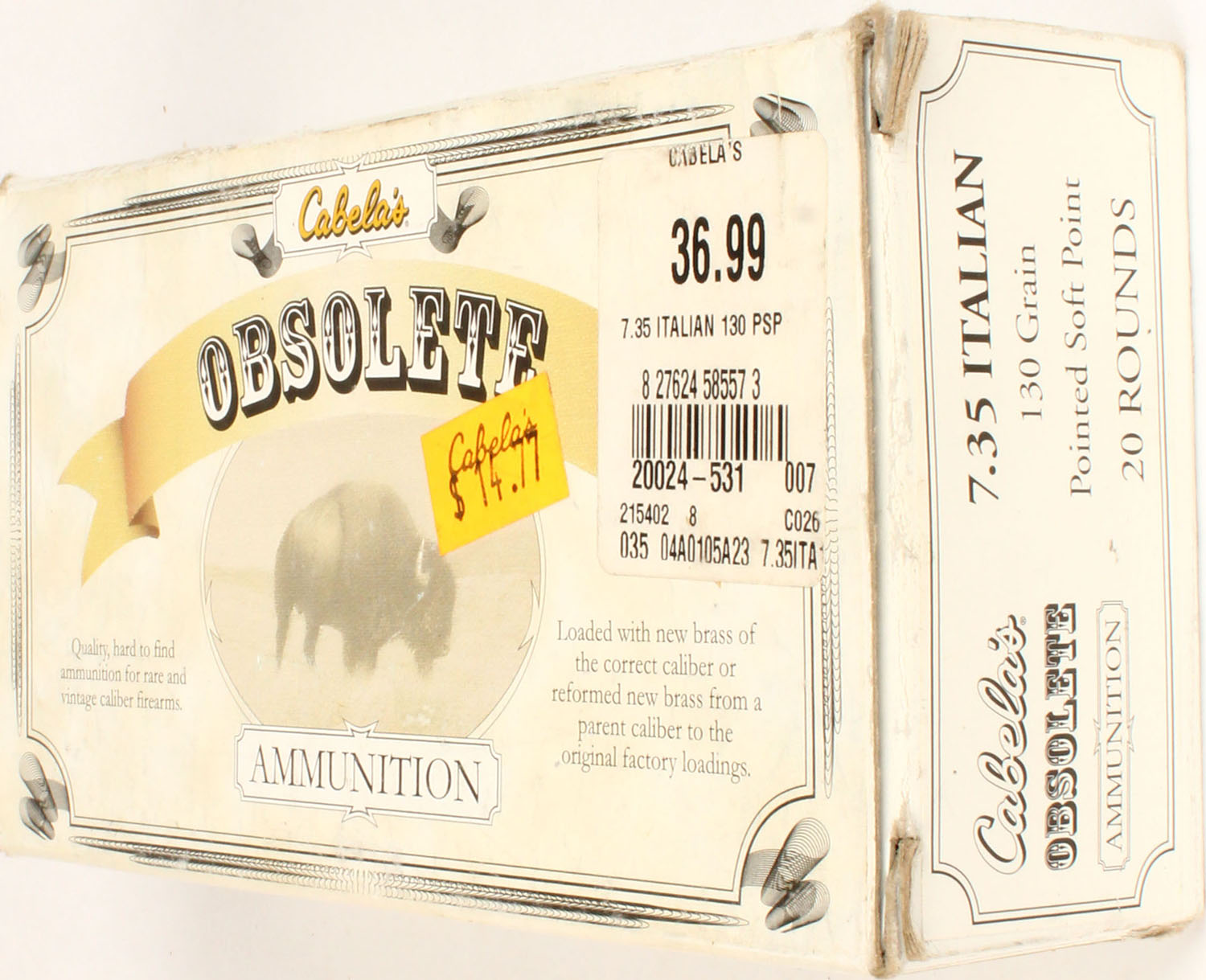 Cabela's, Obsolete Ammo., 7.35 Italian, 130 Grain Pointed SP, Full, 1pc. multi-colored box, box is solid, with excellent color, Ammo is excellent. Grade: Excellent + - Value: 16 to 50