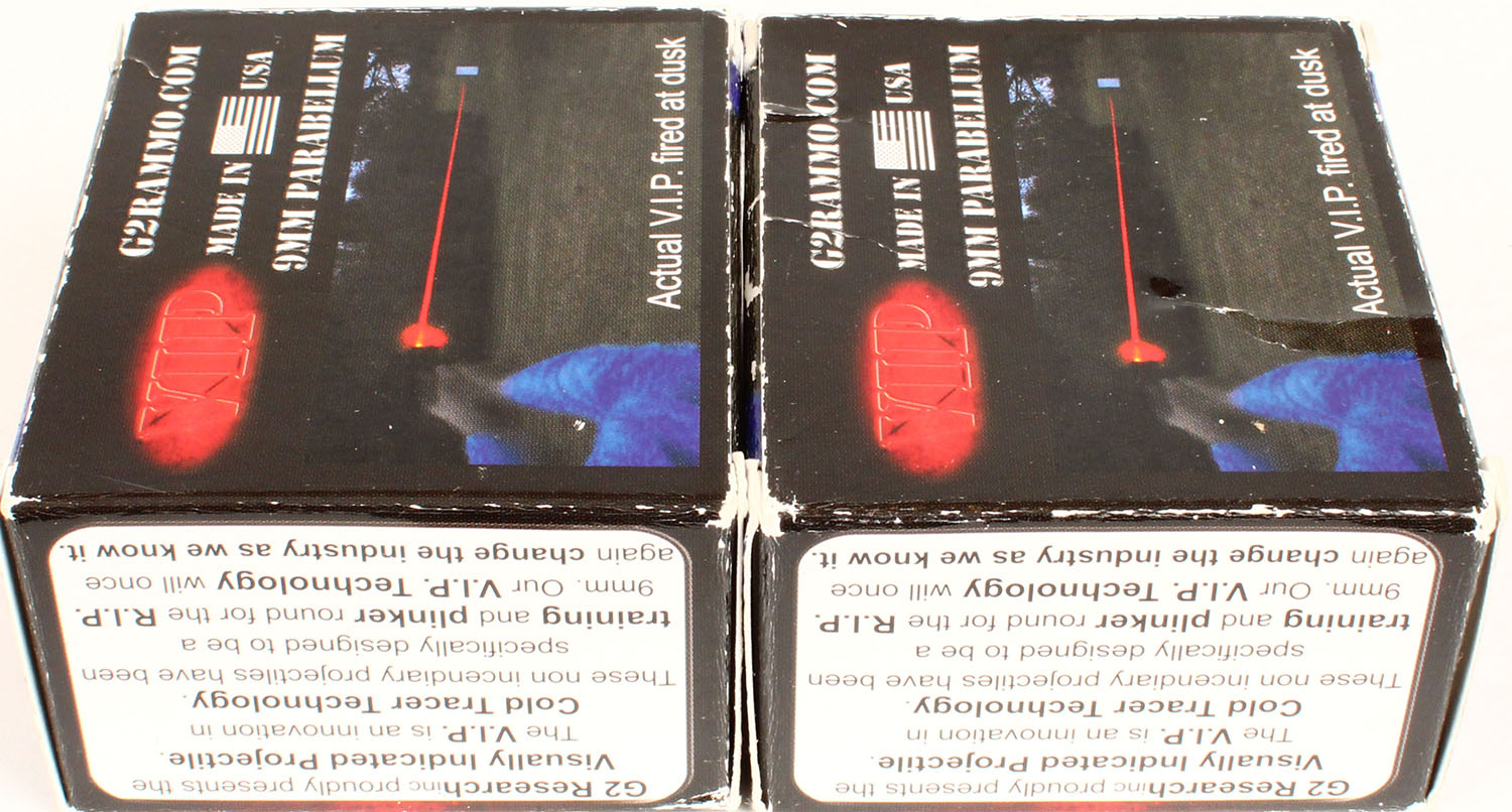 Lot of 2 VIP G2 Research, 9mm, VIP(Visually Indicated Projectile) Cold Tracer Tech.,, Full, 1pc. multi-colored box, box is solid, Ammo is excellent. Grade: Excellent - Value: 40 to 100