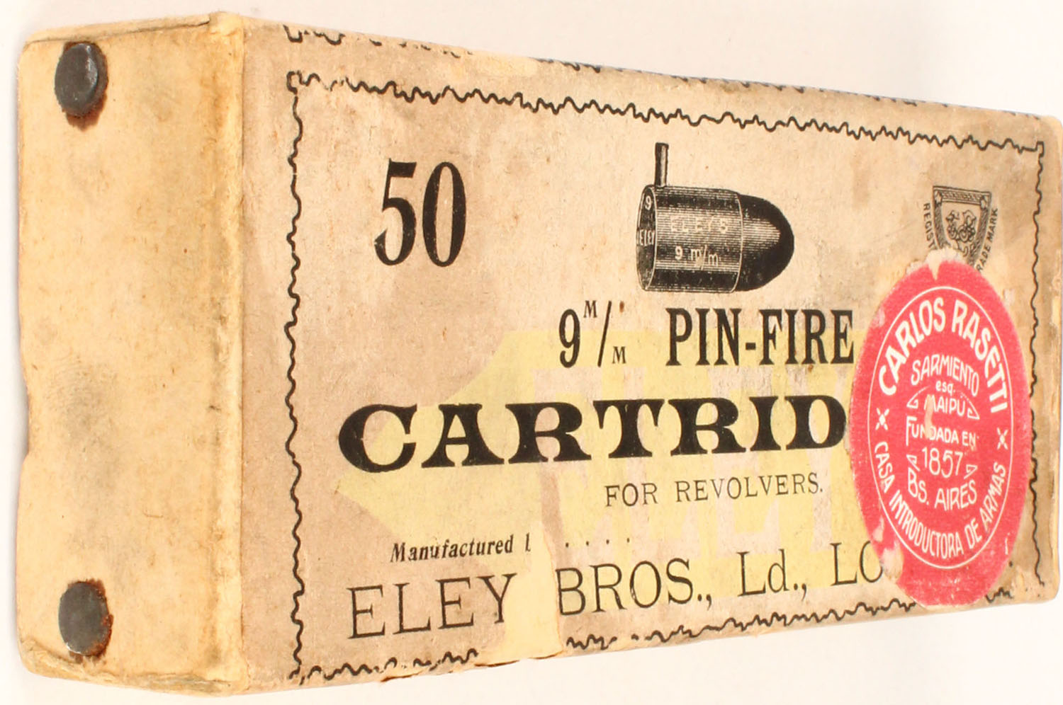 Eley Bros, 9 m/m Pin-Fire Cartridges For Revolvers, Empty, 2pc box, some age soiling to label, box is solid. Grade: Very Good + - Value: 50 to 200